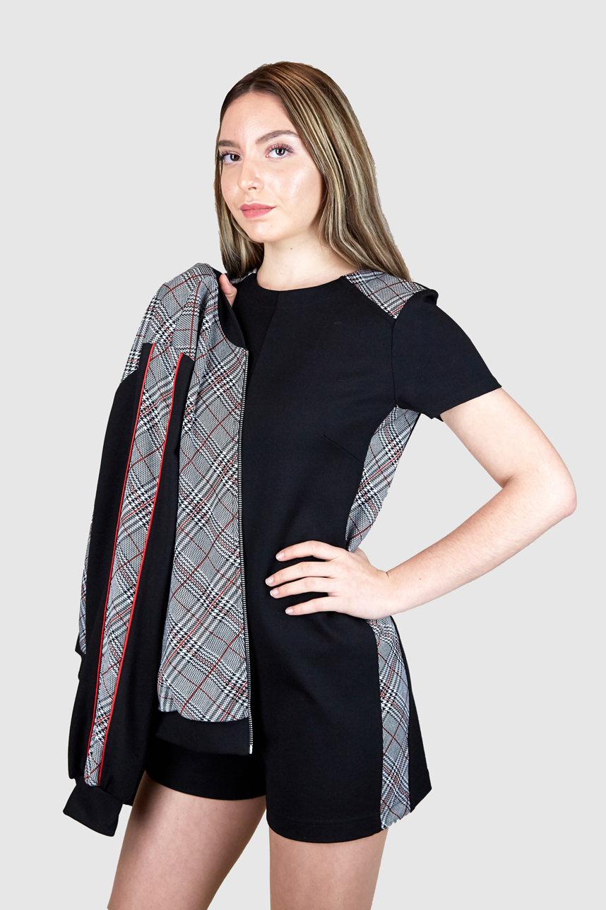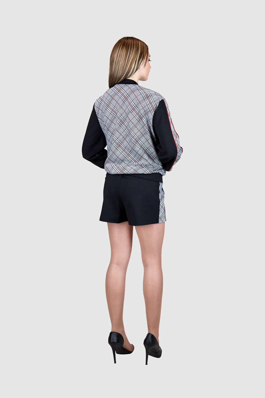 Bomber unisex, motif carreaux prince de Galles, des manches noires ornées des empiècements de même tissus à carreaux et du passe poil rouge.