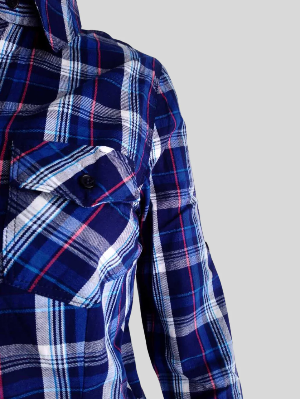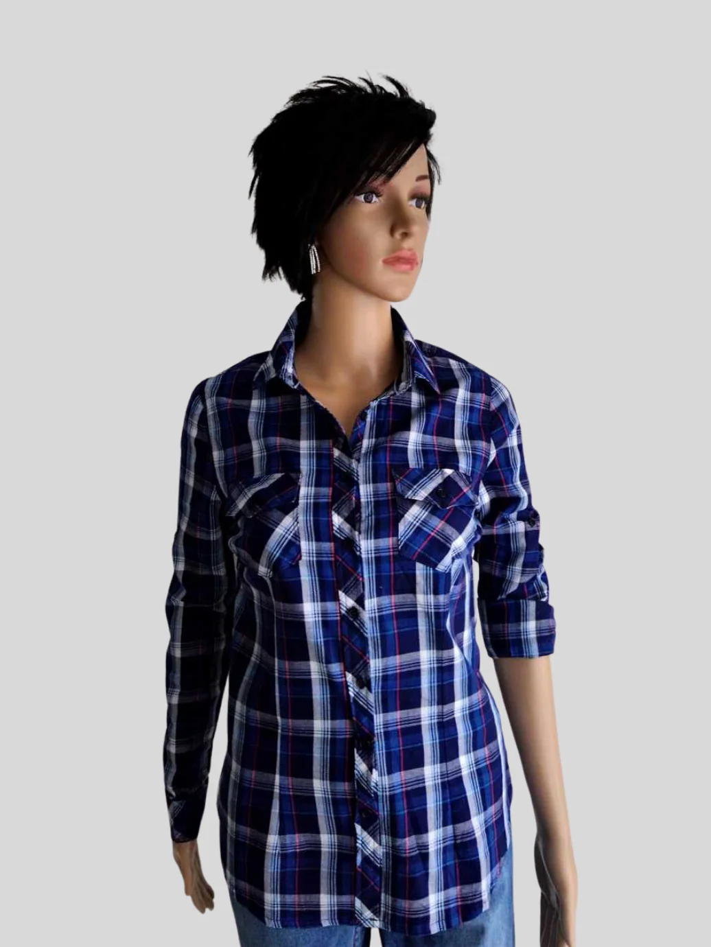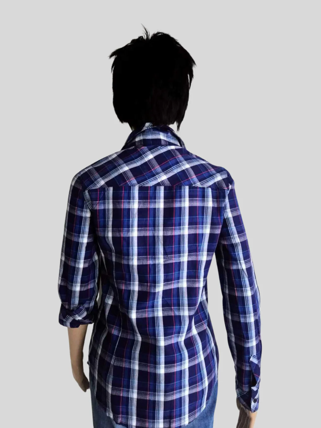 - Chemise bleue à carreaux.