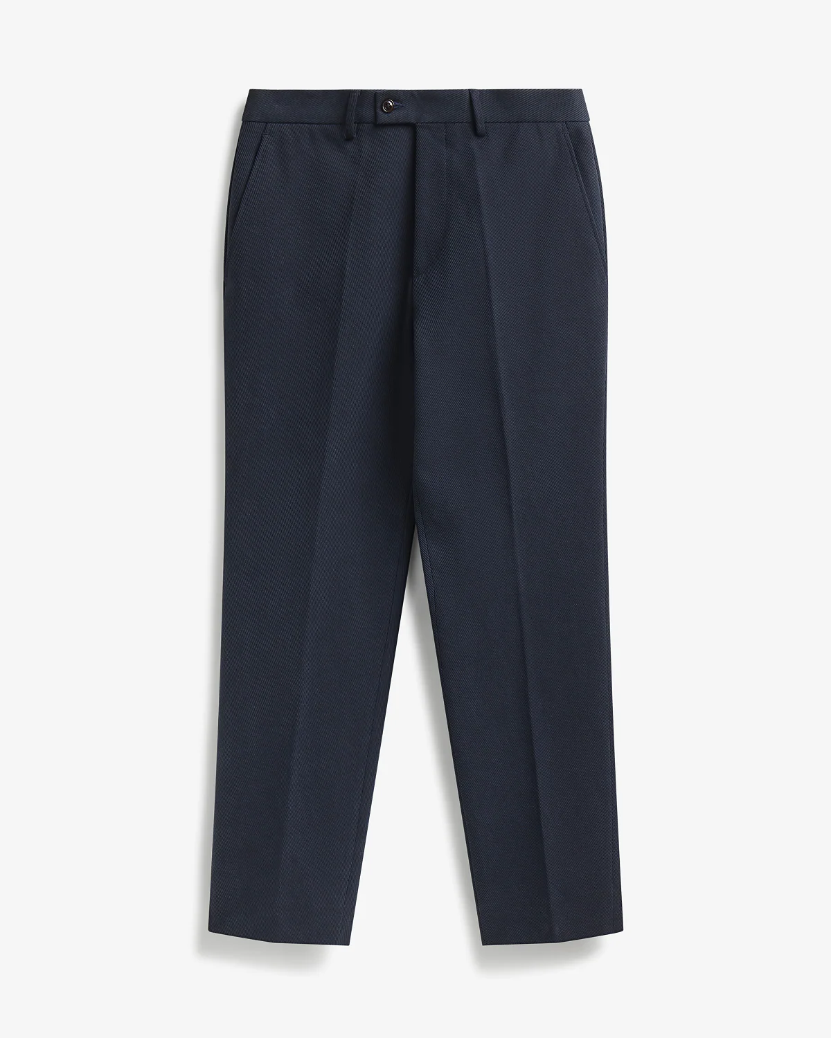 Le pantalon tailoring marine, l’élégance moderne au quotidien. Confectionné en tricotine 100% coton portugaise, une toile dense et raffinée au toucher légèrement texturé. Tisseur depuis 1935. Coupe tailoring fuselée pour une silhouette ajustée, structurée à la taille puis légèrement resserrée à la cheville. Plis cassés à l’avant, détail sartorial pour un tombé impeccable. Poches latérales à l’italienne et poches dos passepoilées boutonnées. Fabrication tunisienne.