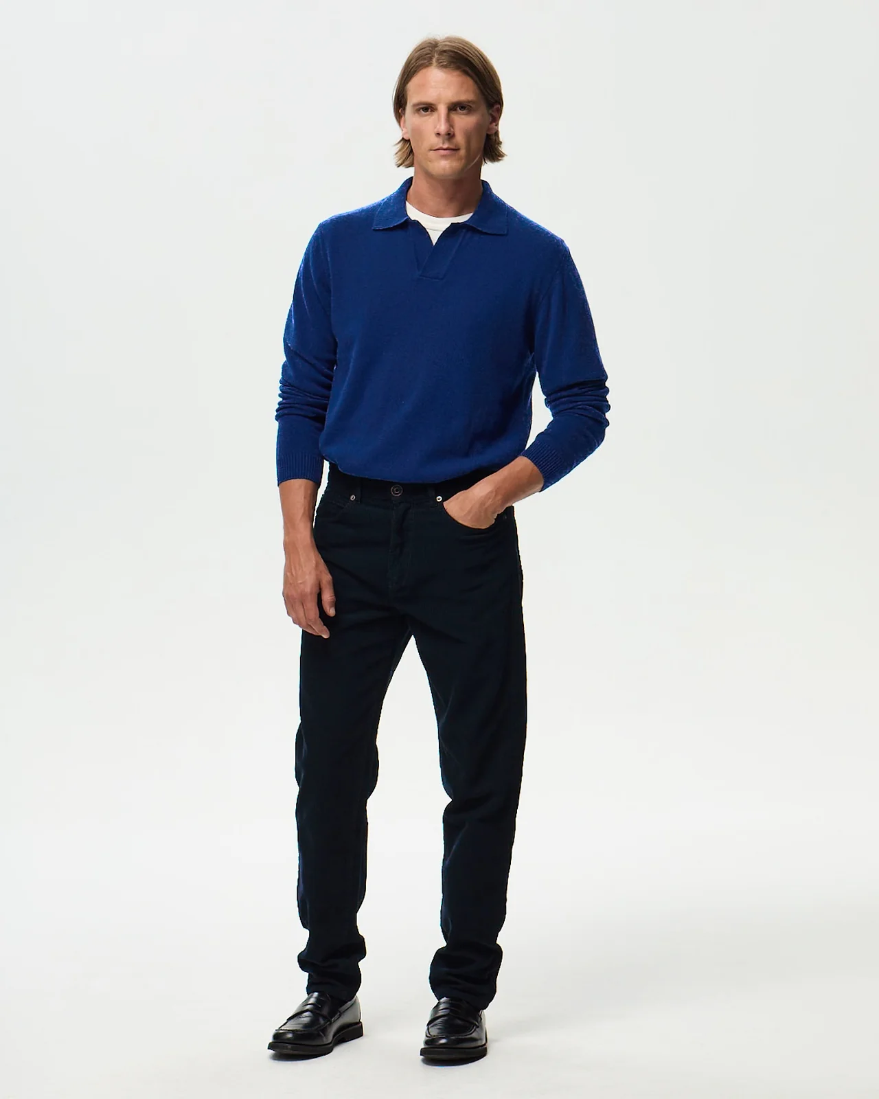 Le 5 poches essentiel du vestiaire masculin revisité en velours, l’indémodable par excellence. Reprend les codes du jean dans une matière noble et chaleureuse. Coupe semi-ajustée pour mettre en valeur la silhouette. Poches devant avec des angles carrés légèrement arrondis et poche ticket. Teinte navy profonde mise en valeur par les côtes du velours. Tissu turc de qualité. Fabrication marocaine.