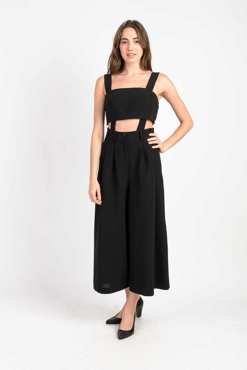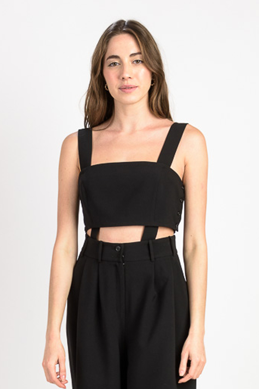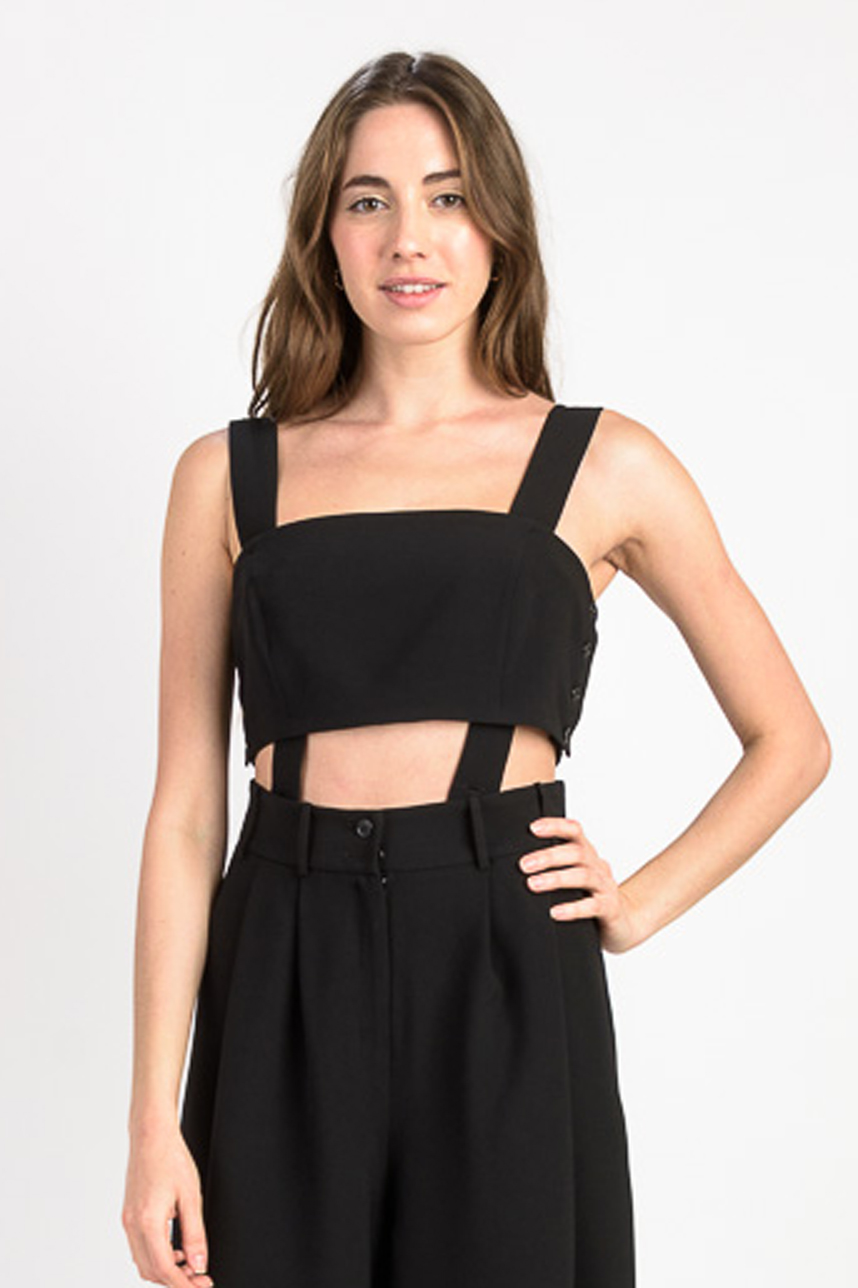 Débardeur noir, modulable grâce à des bretelles et des pattes noires amovibles.
