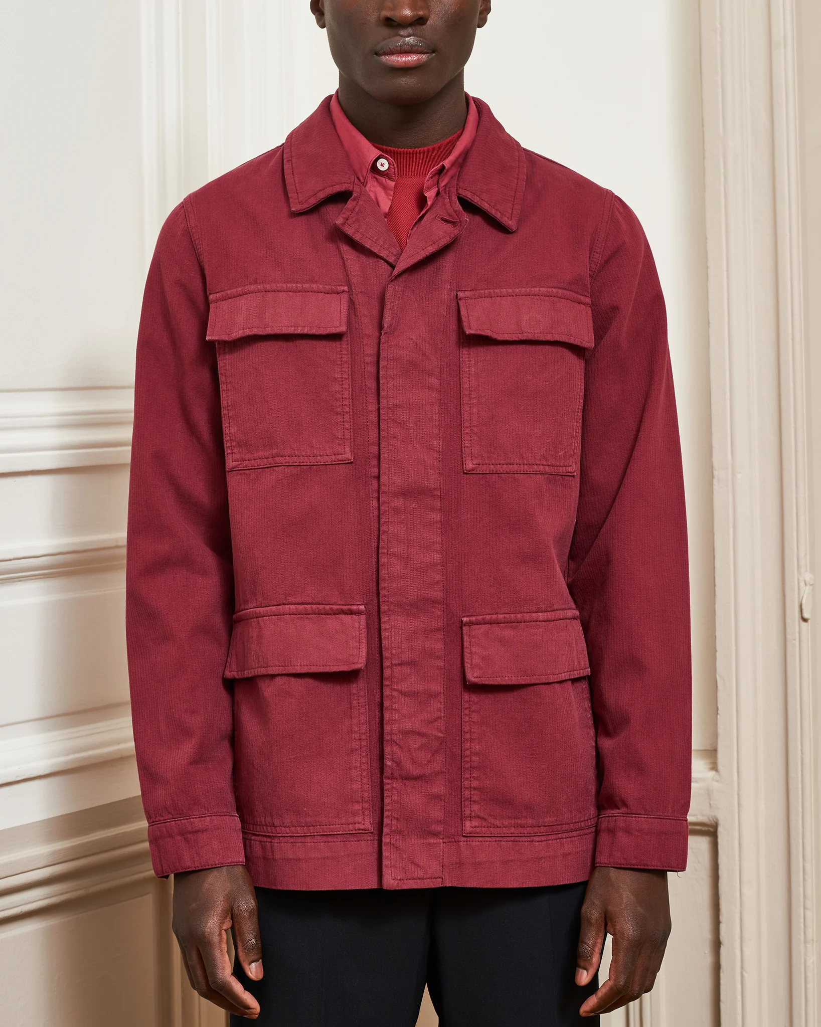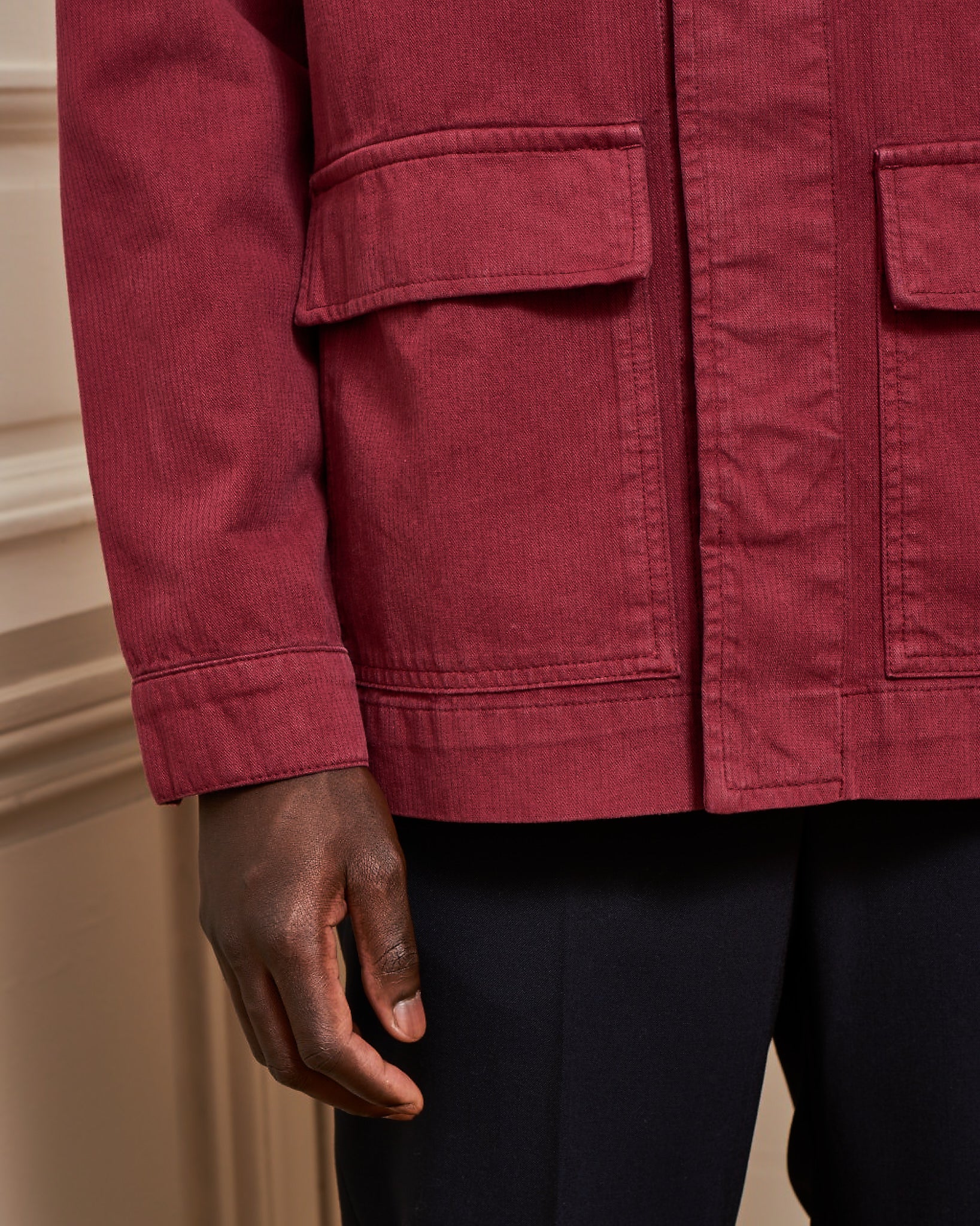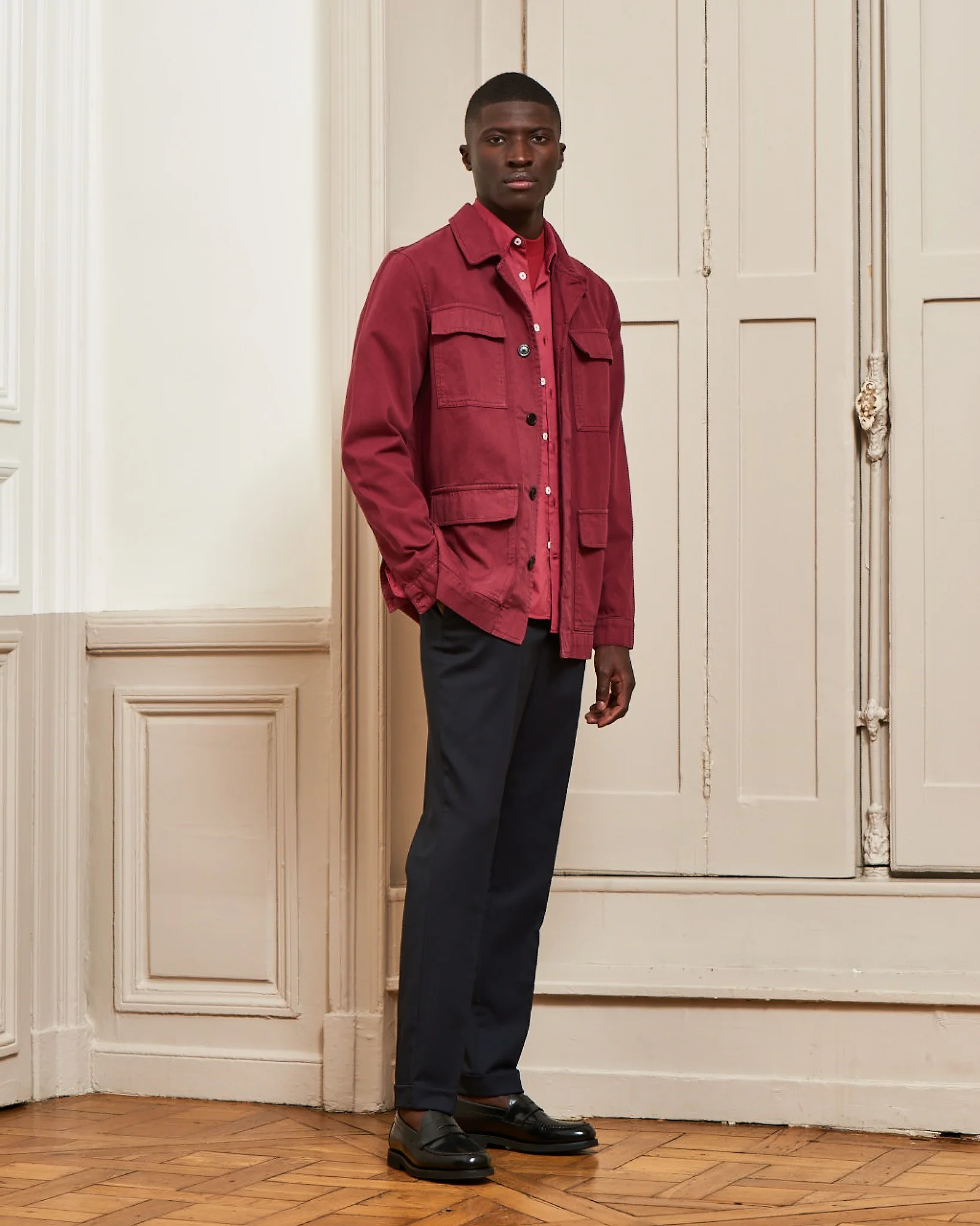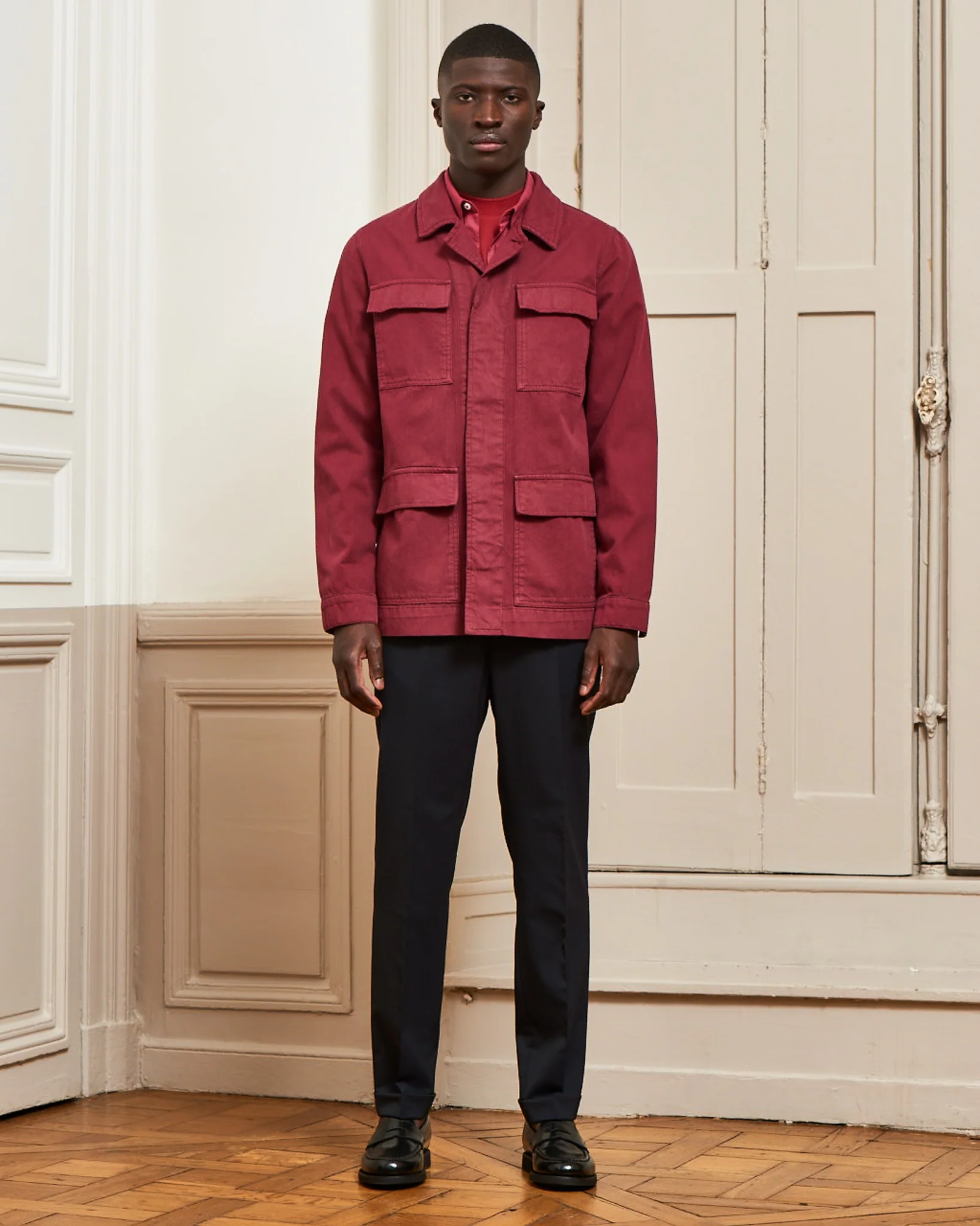 La Delorme est une veste à mi-chemin entre notre veste de peintre et les sahariennes d’inspiration militaire. Vous remarquerez ses détails soignés : son col façon « tailleur », sa patte cachée boutonnée, et sa patte de serrage dans le dos notamment. Elle a été confectionnée dans un canevas de coton biologique français et dans quatre coloris : Berry, Cerulean, Mousse et Navy.