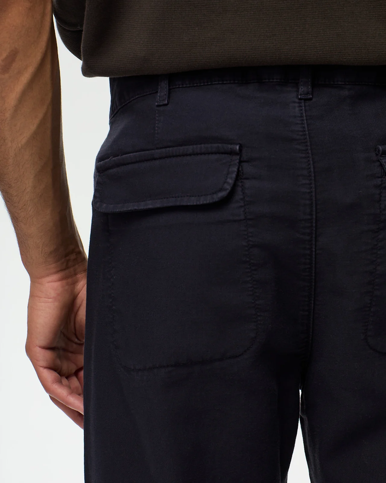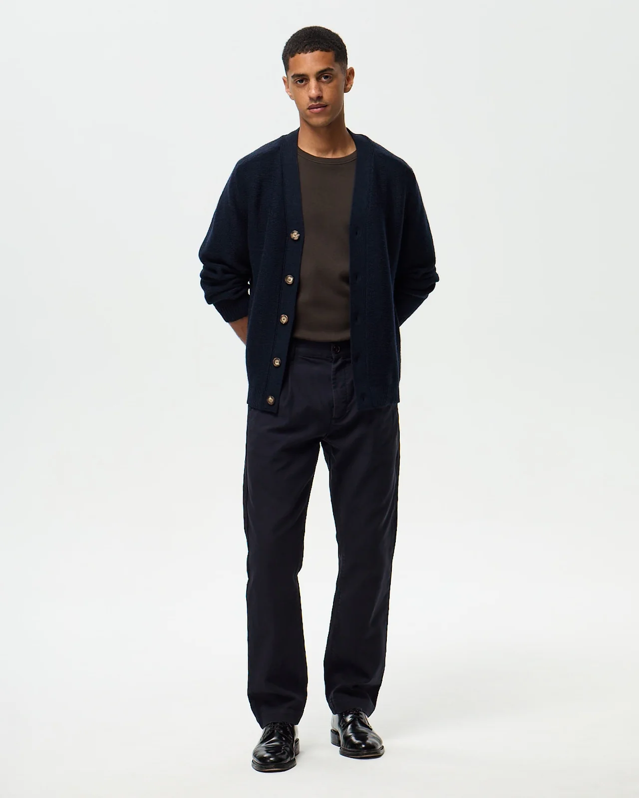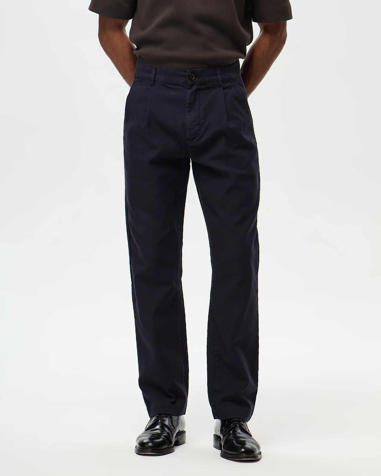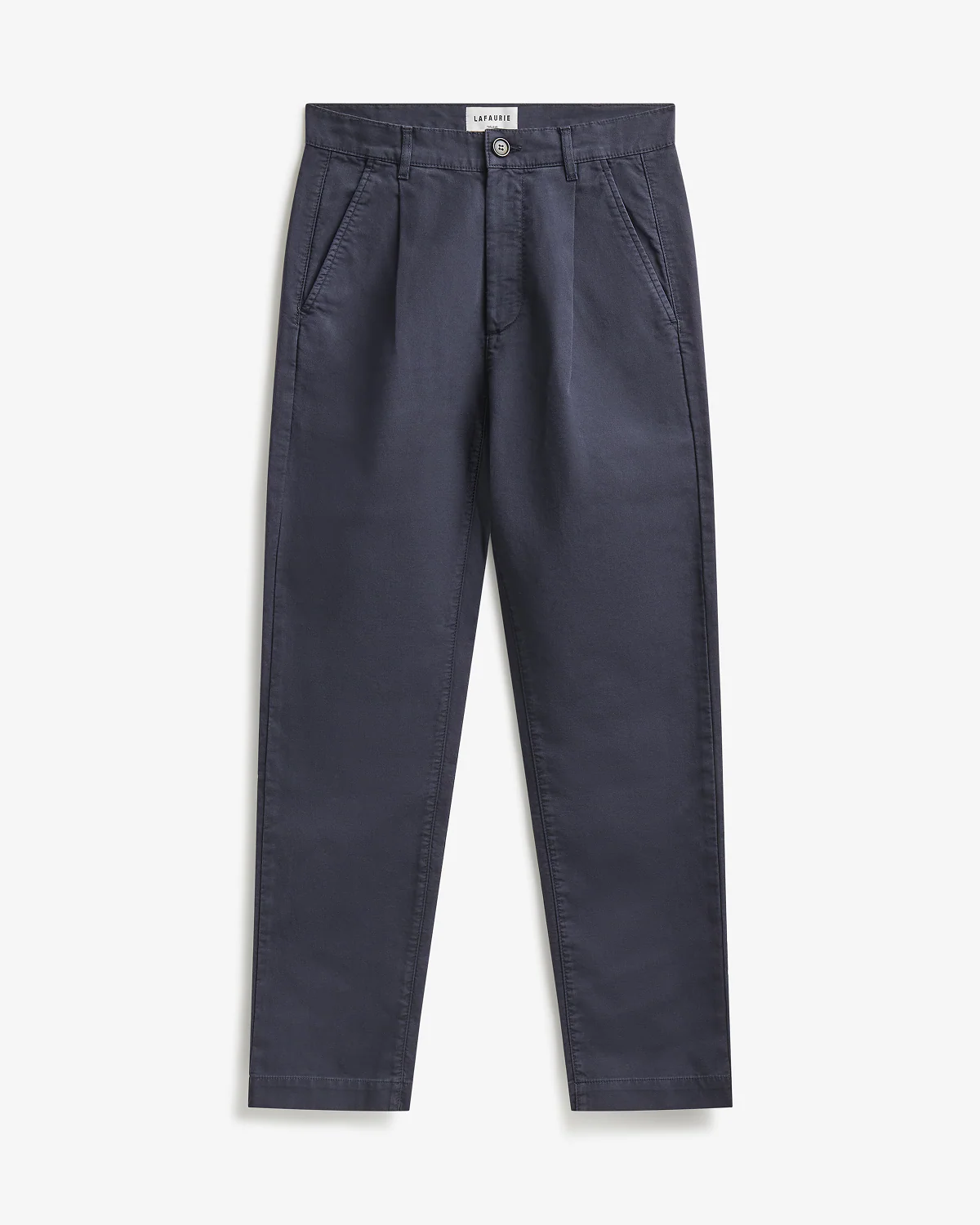 Le chino à plis pour un confort moderne, l’incontournable du vestiaire masculin. Confectionné en 100% coton italien, une toile souple et dense au toucher légèrement duveteux et à la belle tenue. Coupe droite confortable pour une silhouette ample mais structurée. Poches italiennes et poches dos à rabats boutonnés. Coloris marine intemporel et polyvalent. Fabrication marocaine.