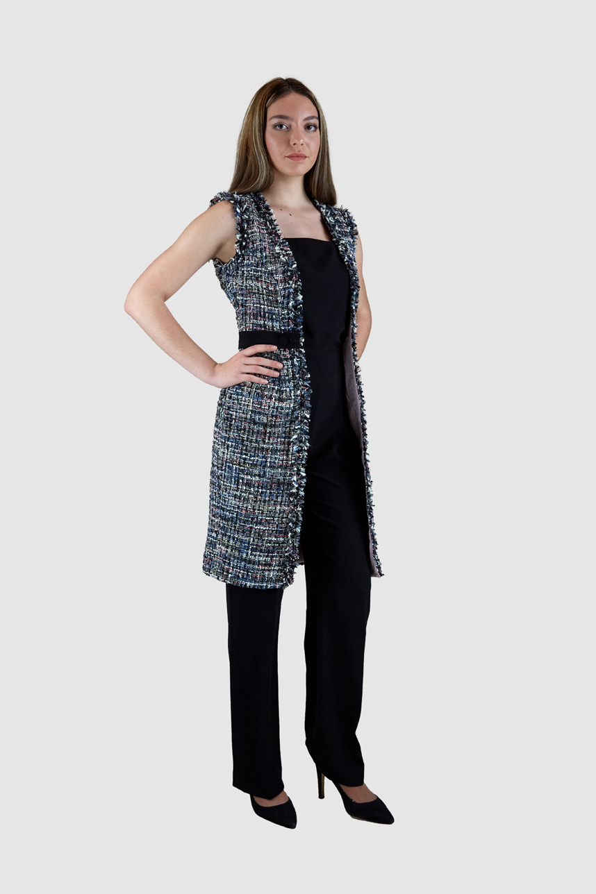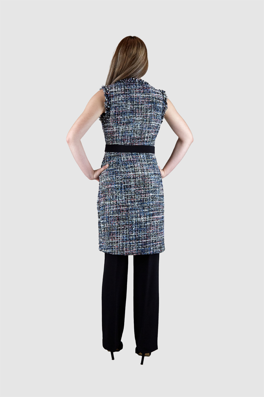 Gilet en tweed fixé par dessus grâce à la ceinture qui se déboutonne de la combinaison pour se poser sur le gilet afin de lui donner un bon maintien et une allure fine en marquant la taille.