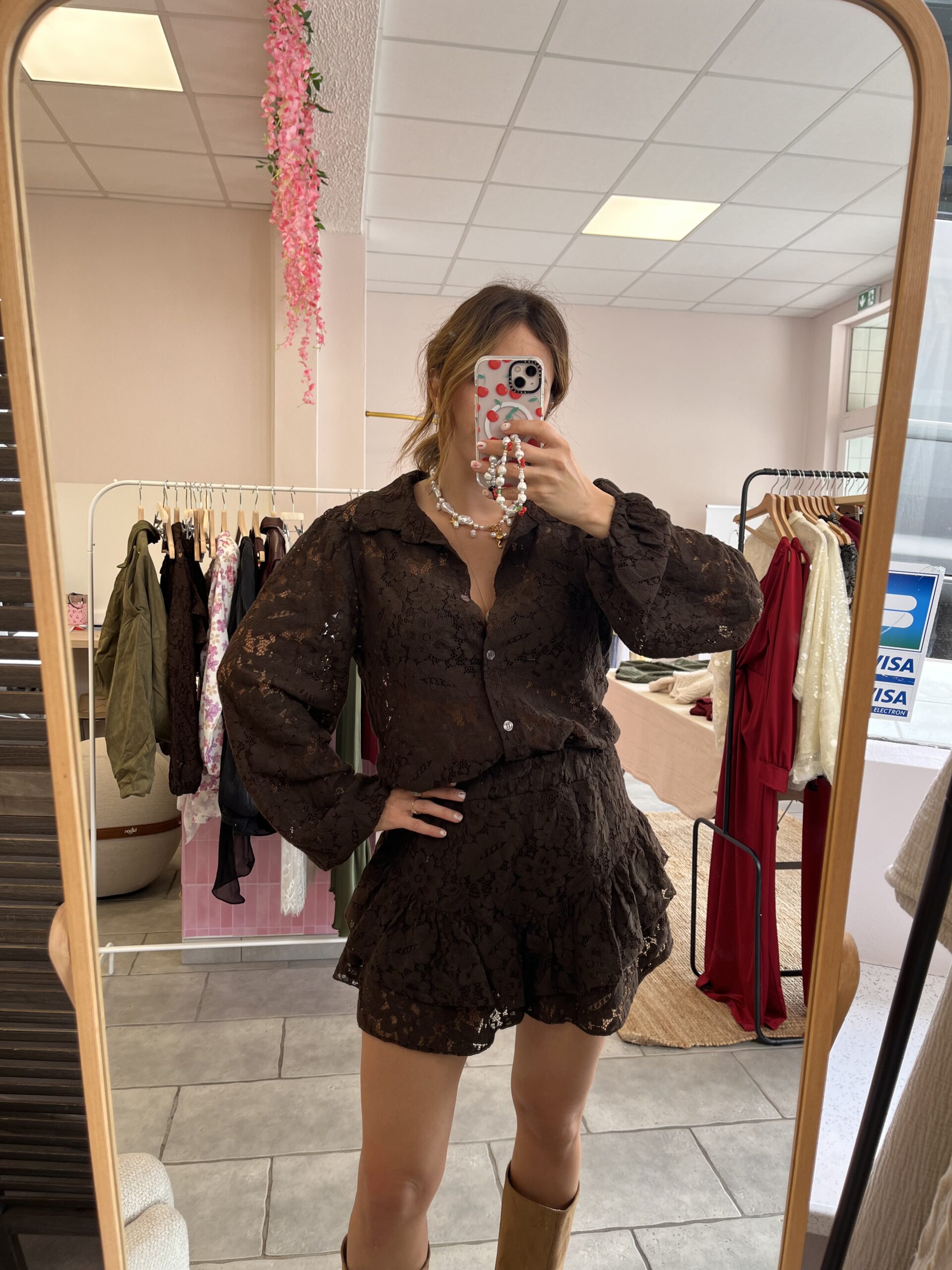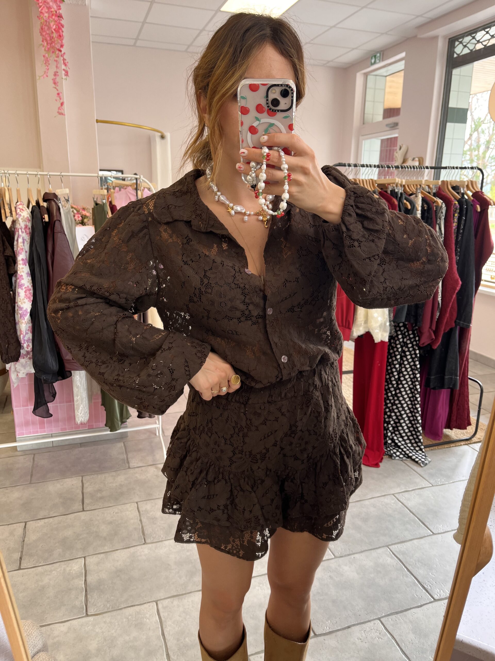 Ensemble jupe-short et chemisier en dentelle marron, haut transparent et bas doublé.