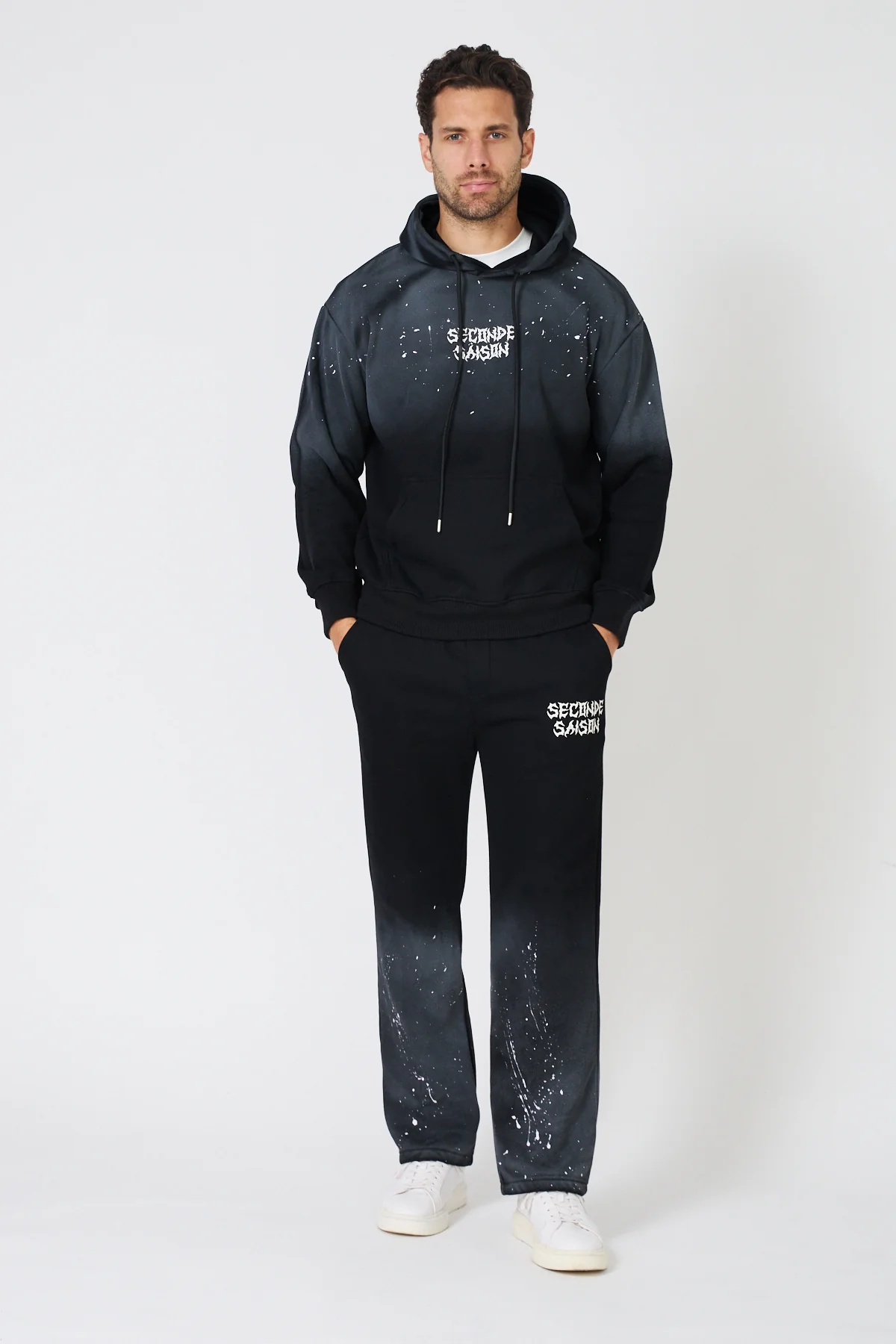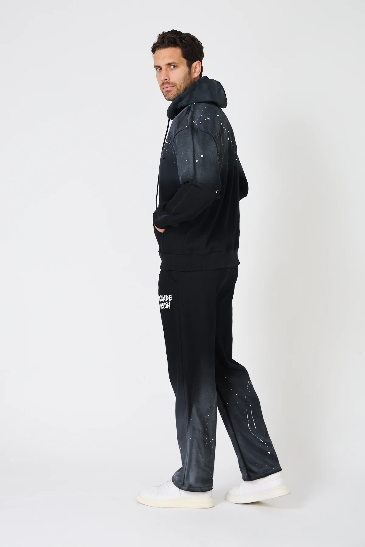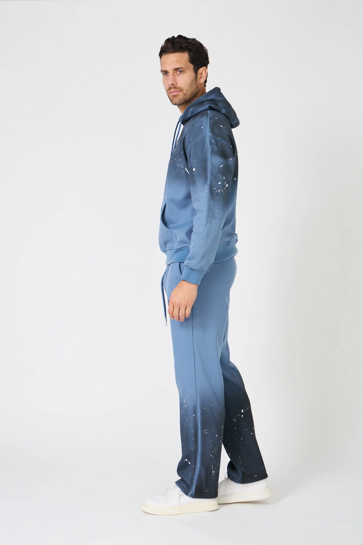 Sweat à capuche bleu au look urbain audacieux, avec dégradé ombré du gris au noir profond et effet éclaboussures de peinture pour un style moderne et original.