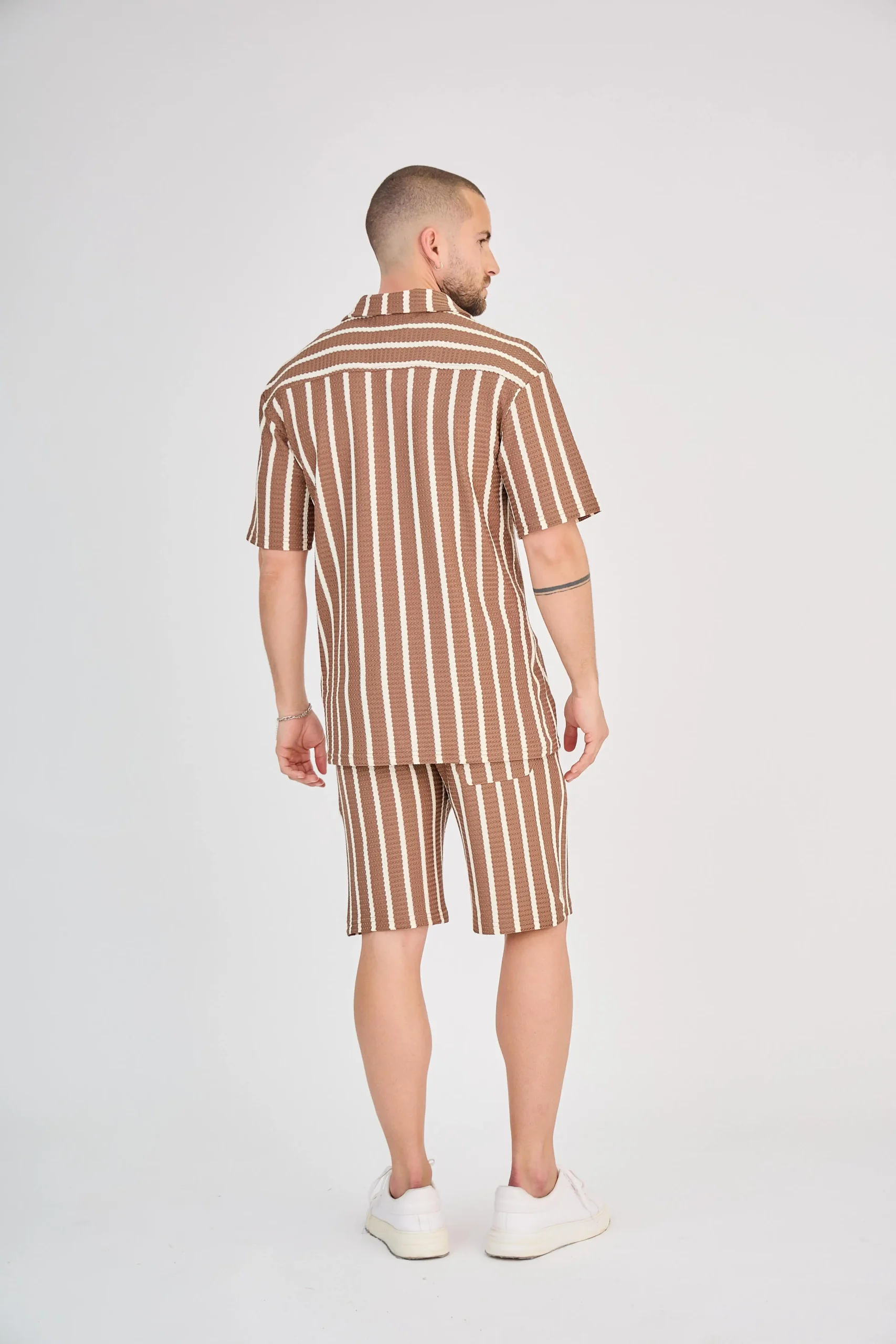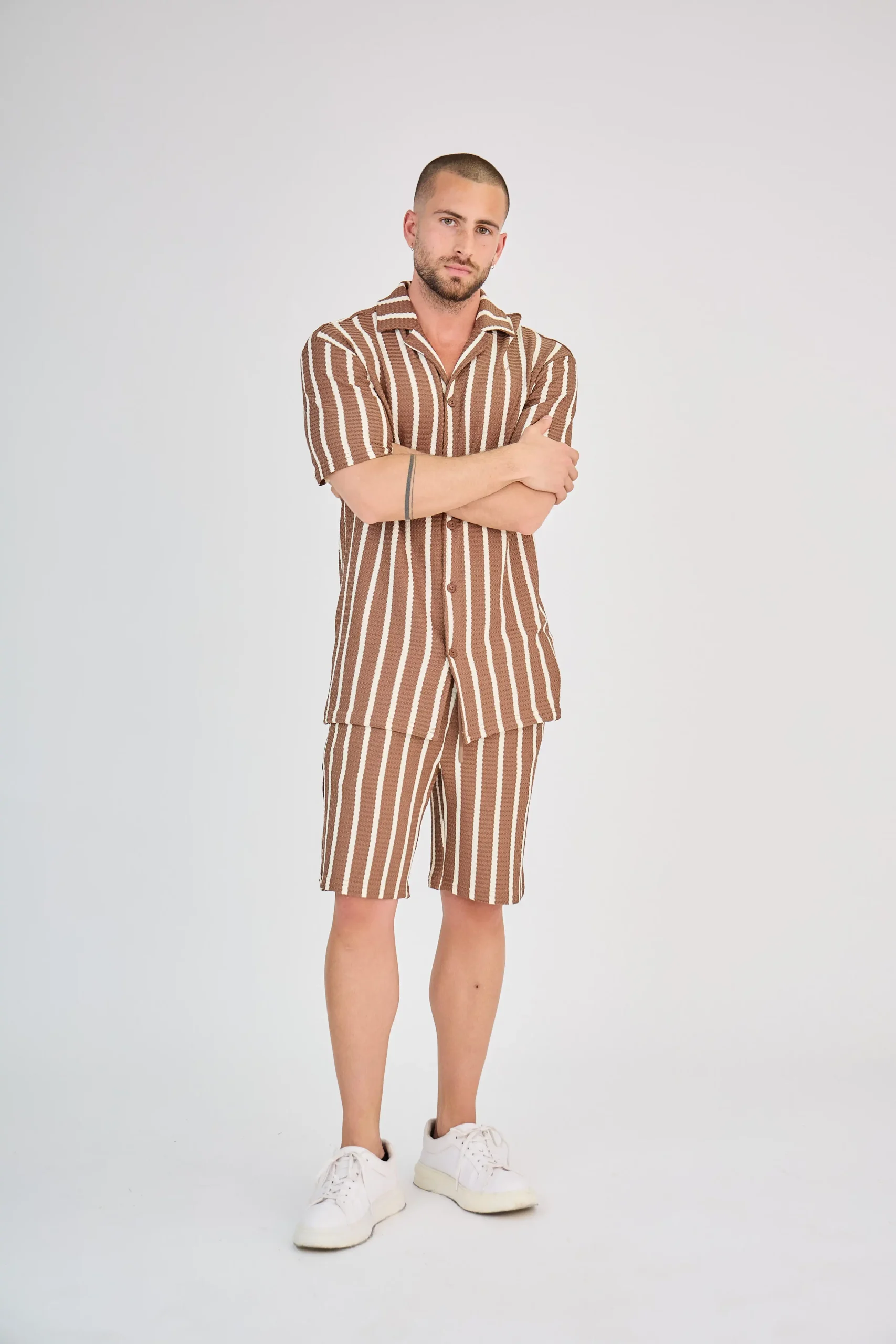 – Chemise manches courtes à rayures en maille nid d’abeille gaufrée