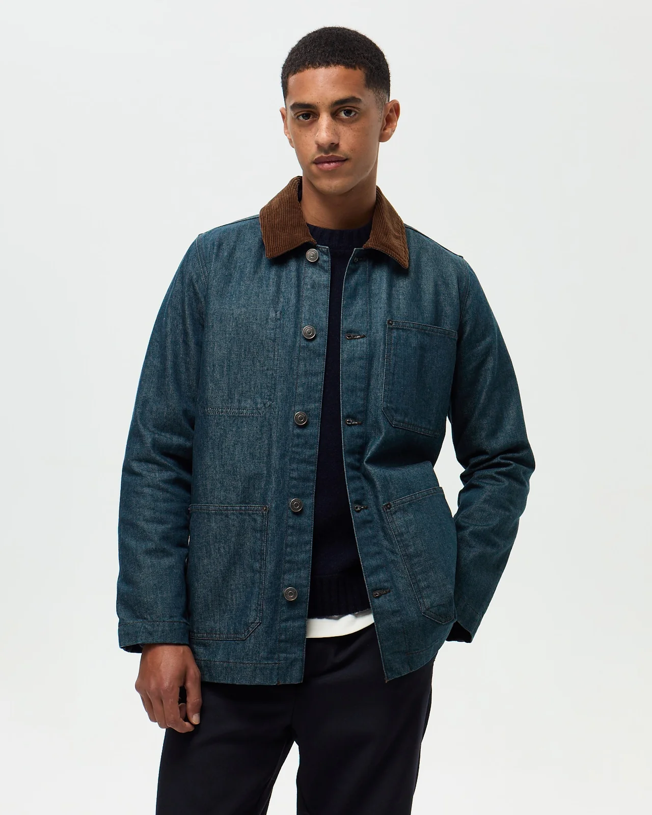 La veste de peintre en denim, l’authenticité workwear revisitée. Confectionnée en denim espagnol, tisseur spécialisé depuis 1846, elle révèle une texture authentique et durable. Son col bi-matière en velours marron contrasté apporte du caractère utilitaire avec une touche rétro distinctive. Construction fonctionnelle multipoches pour un usage quotidien. Coupe droite légèrement ample, pensée pour être portée sur une chemise ou un pull fin. Coloris denim green original et moderne. Fabrication marocaine.