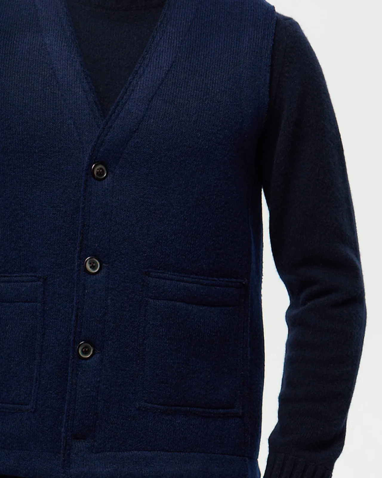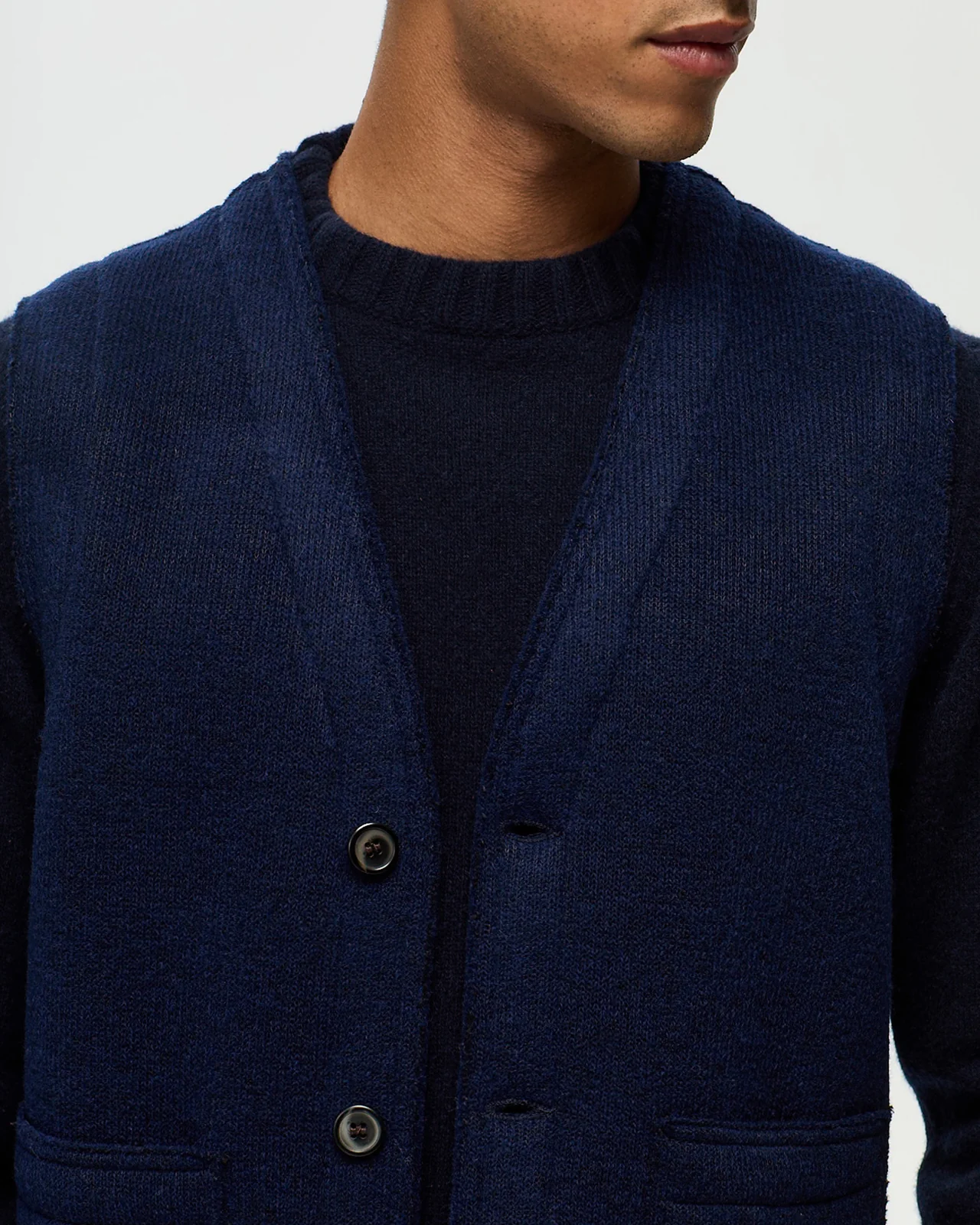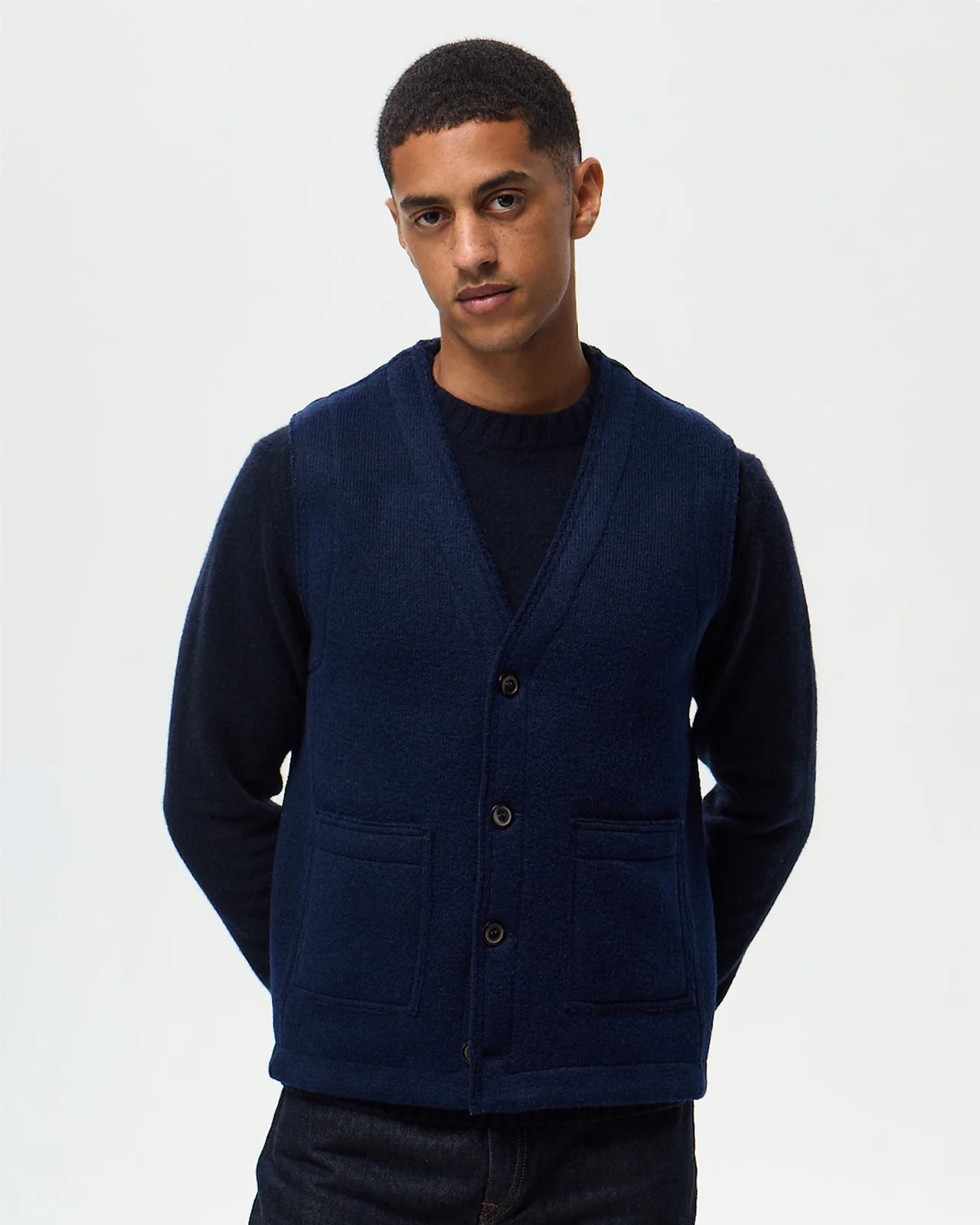 Un gilet intemporel. Une forme classique incontournable du vestiaire masculin. À porter sous une veste de peintre dans un esprit « de costume de peintre » en lainage italien chaud. Une coupe droite qui s’adapte à toutes les morphologies. Un coloris bleu océan facile à associer. Tissu italien d’exception. Fabrication marocaine.