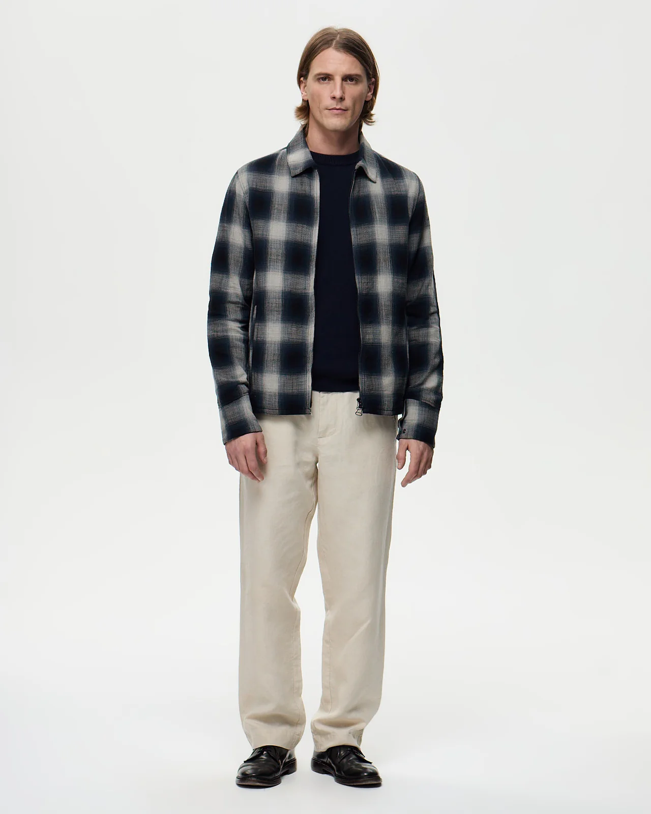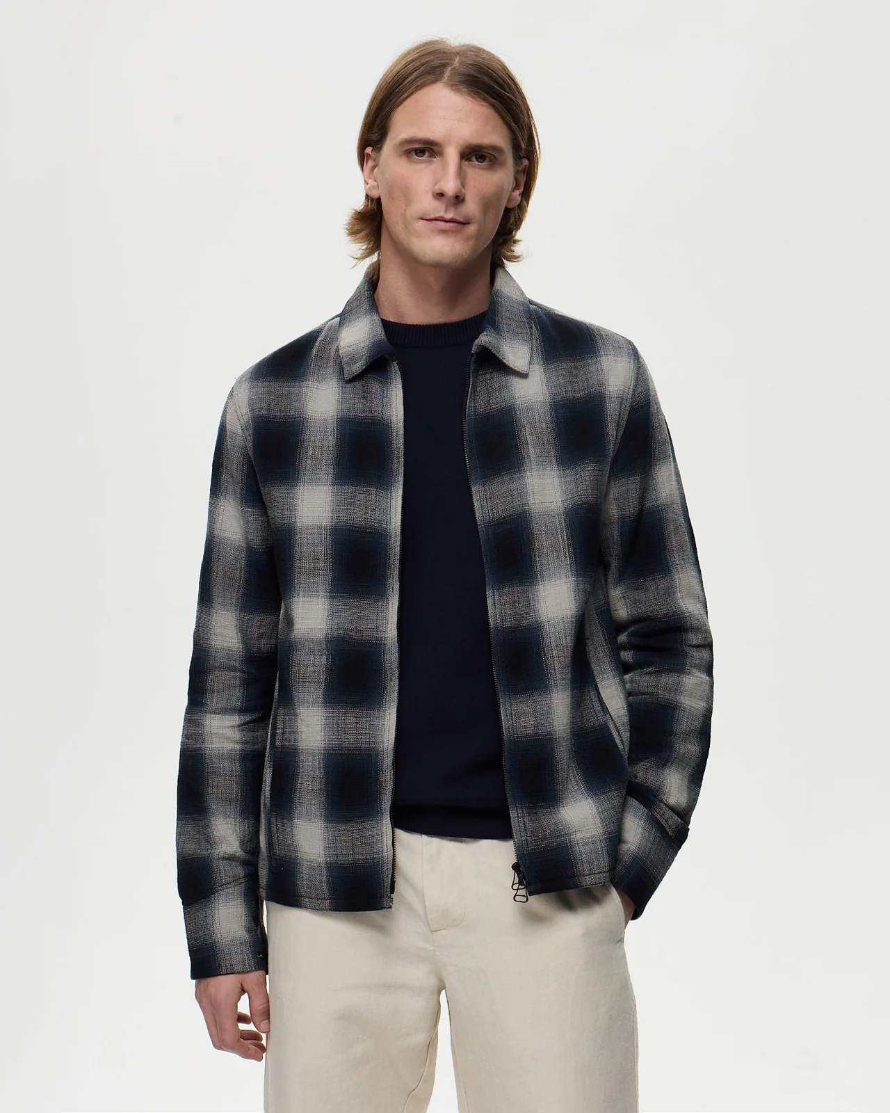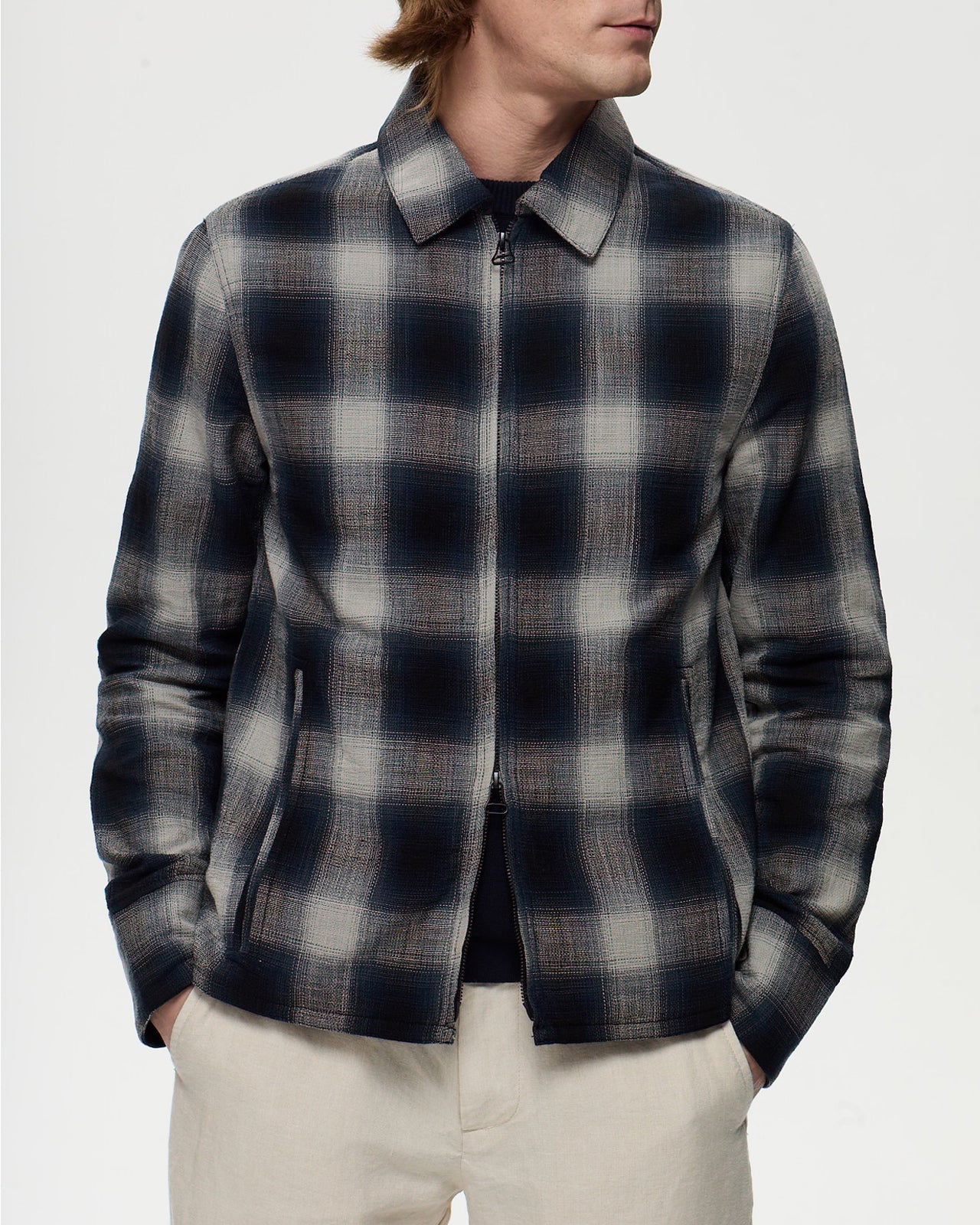 Découvrez HITCHCOCK, la veste chemise polyvalente en tissu à carreaux windowpane, confectionnée en 100 % coton et non doublée. Avec une coupe droite et un col classique à pointe, elle se ferme par une fermeture éclair double curseur. La veste est dotée de deux poches extérieures passepoilées avec double passepoil, ainsi qu’une poche intérieure passepoilée. Les poignets sont doublés avec le même tissu et se ferment par des boutons.