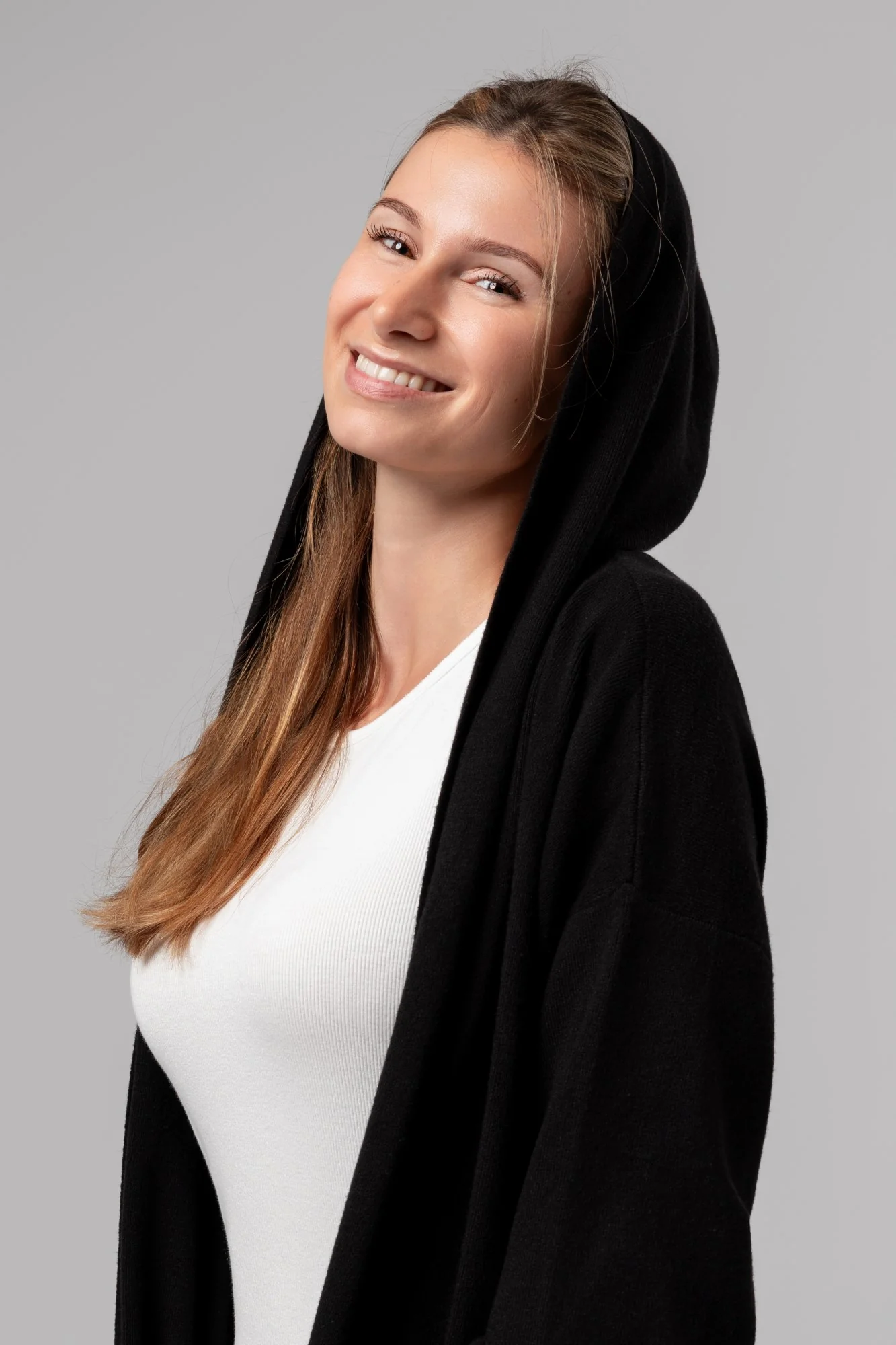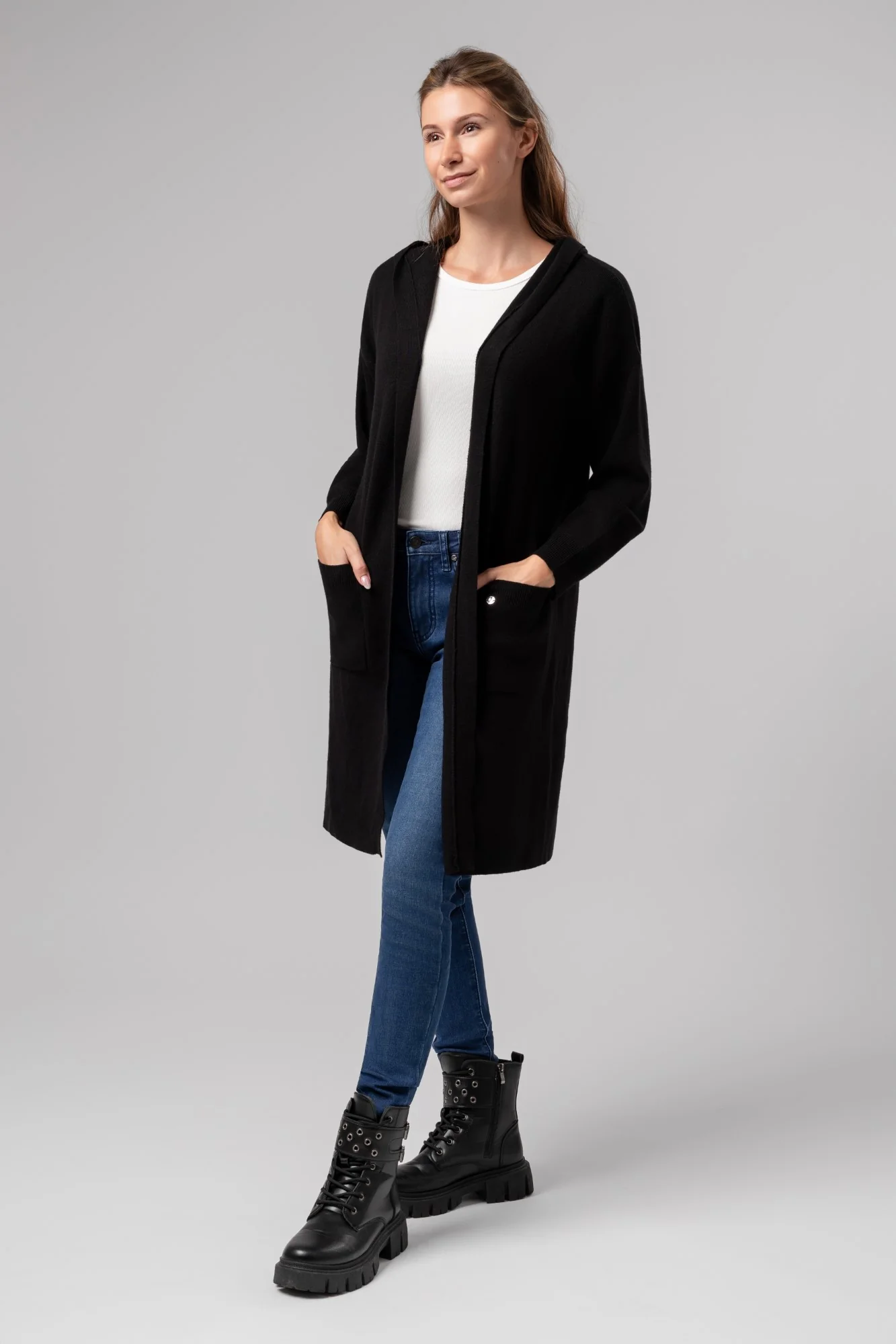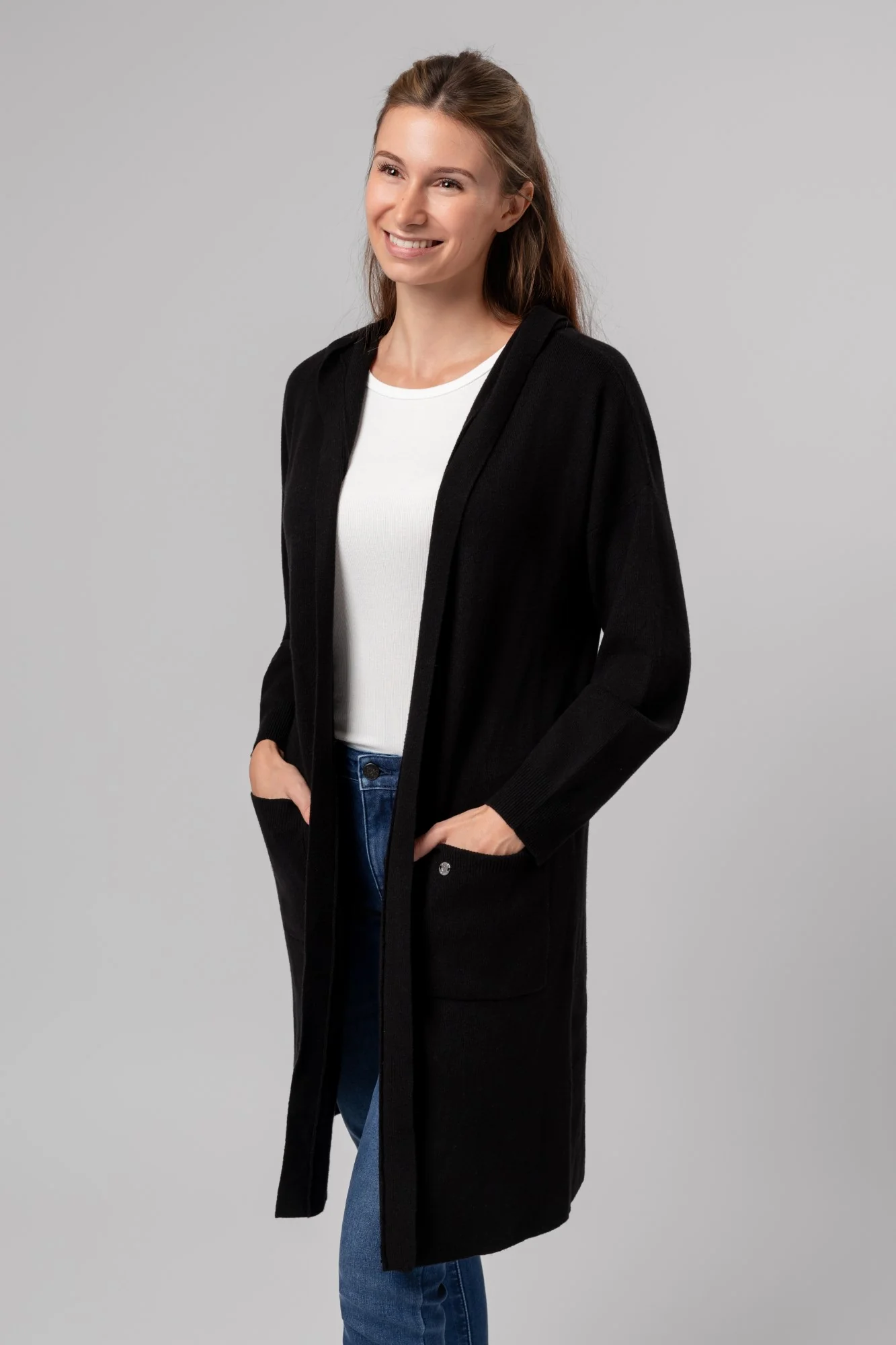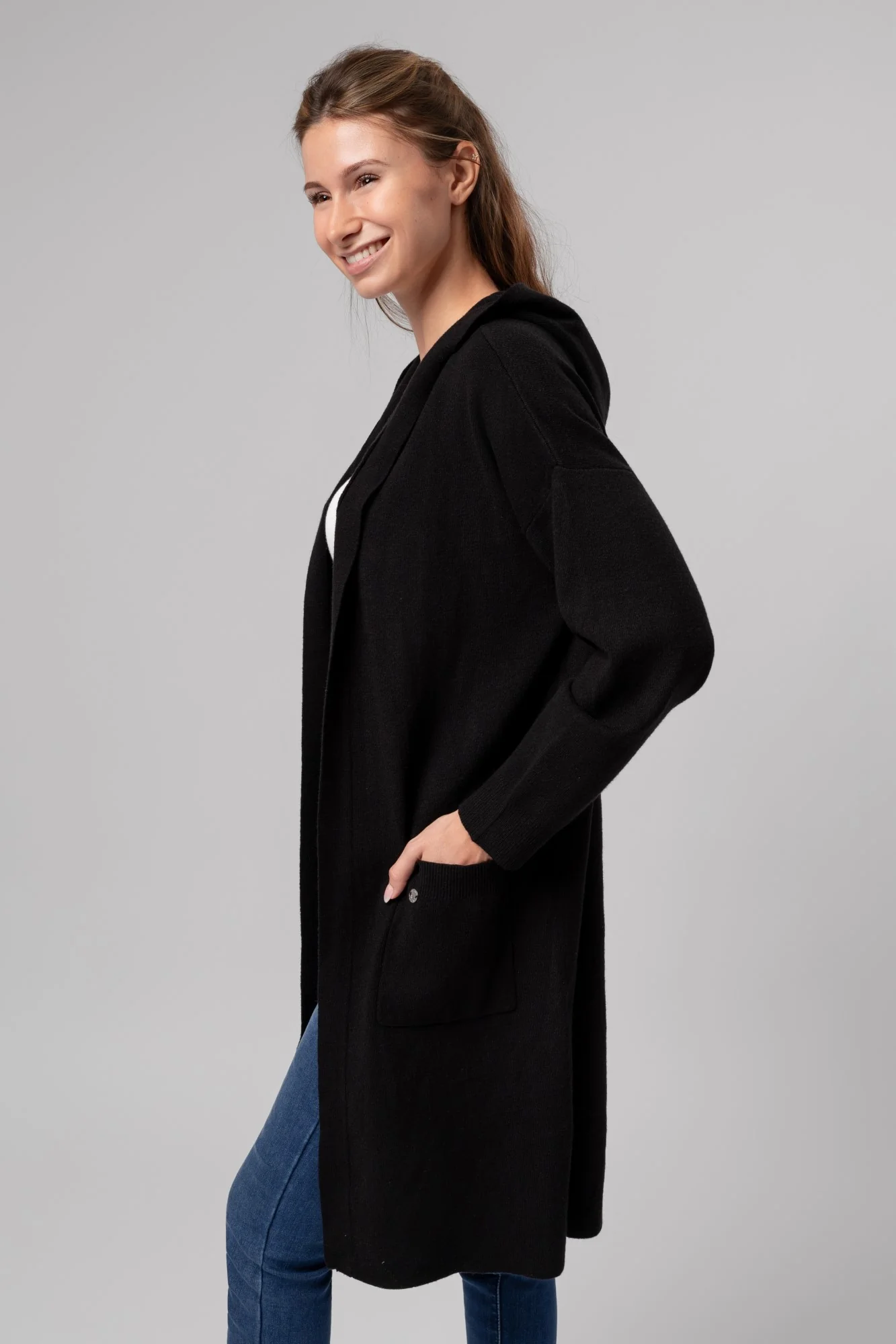 Long cardigan en maille avec capuche