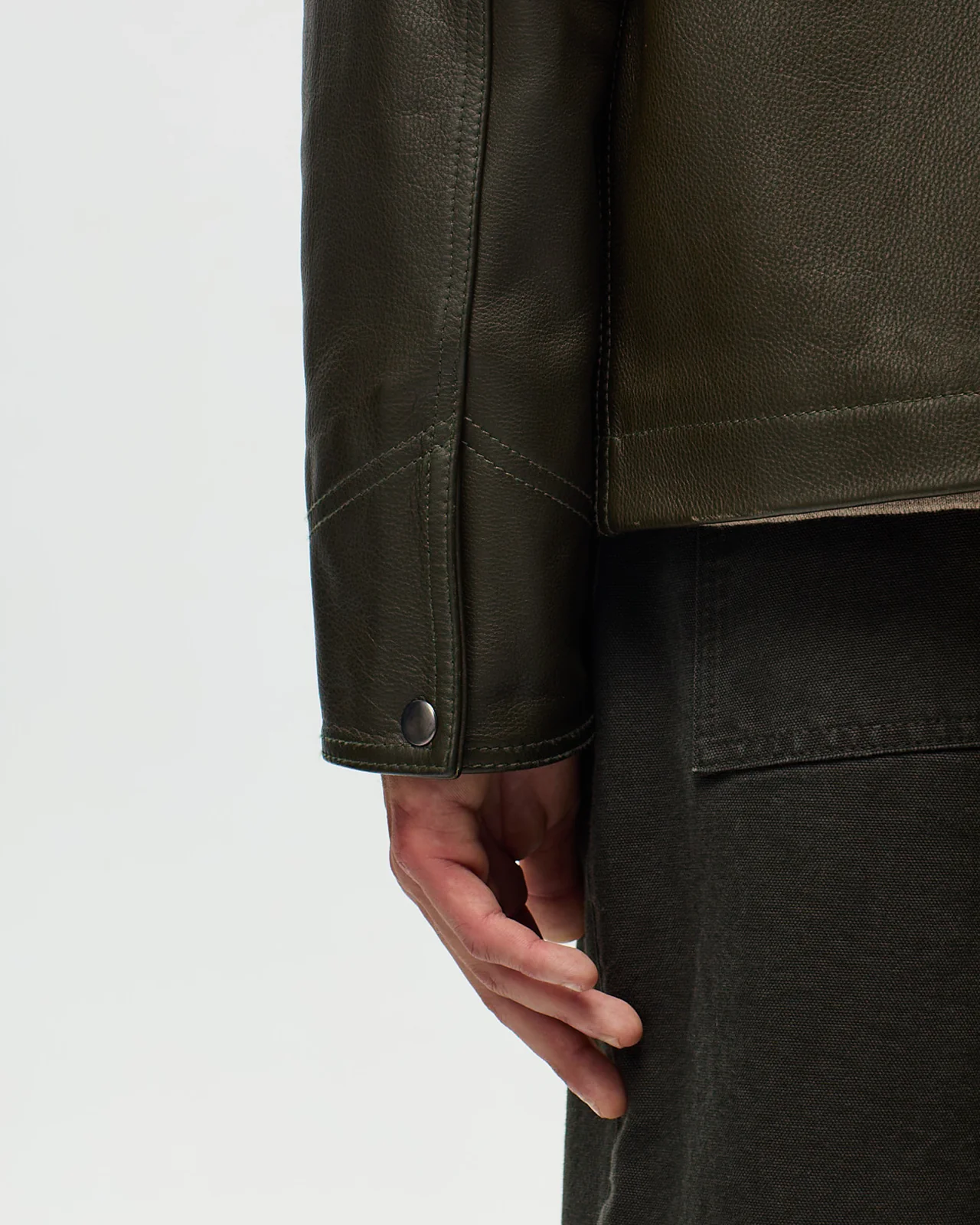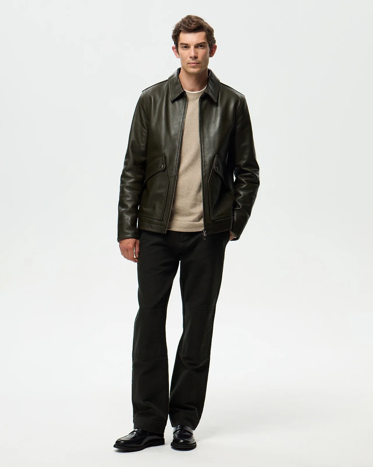Le blouson en cuir ouatiné d’inspiration militaire revisité avec élégance, taillé dans un cuir marocain de vachette en teinte vert cèdre profonde et originale. Sa coupe droite légèrement ajustée aux lignes nettes évoque l’esprit uniforme, tandis que sa fermeture zippée double curseur finition gun métal s’accompagne de poches plaquées à rabat avec ouverture latérale. Provenance matière et fabrication marocaines d’excellence.