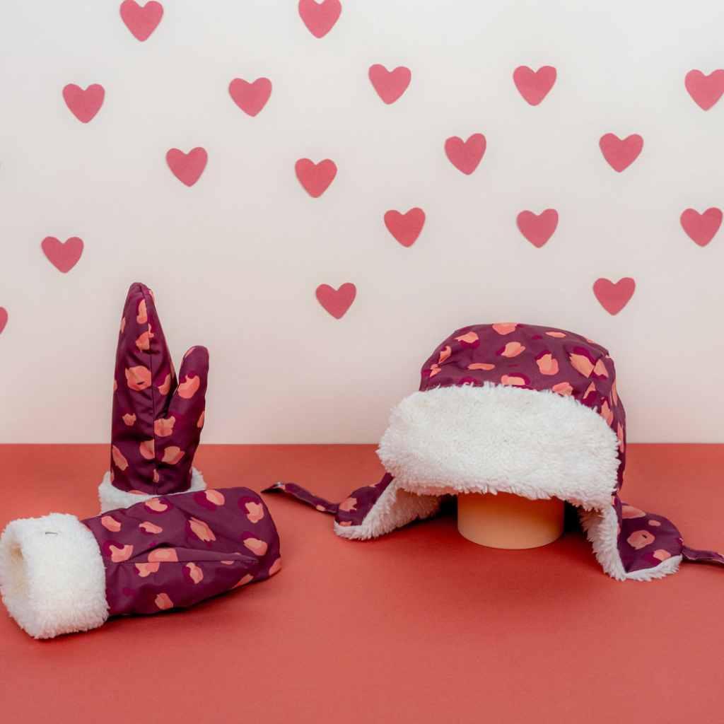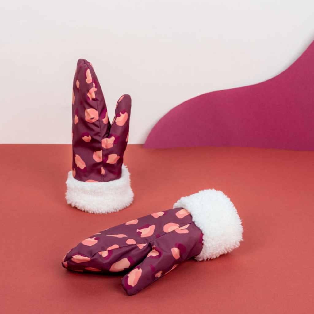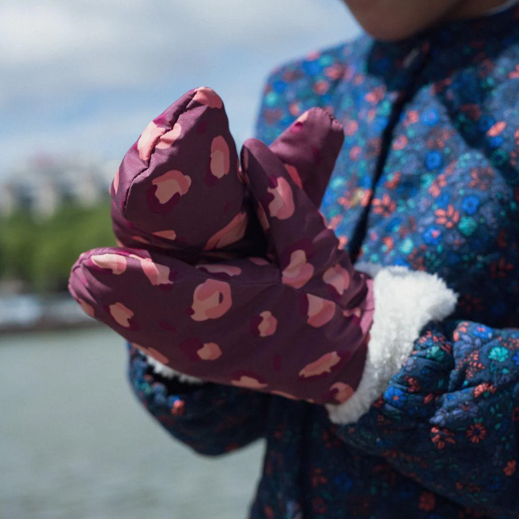 Paire de moufles imperméables, disponibles de 6 mois à 6 ans Intérieur polaire et manches en fausse fourrure très douce Motif Graou bordeaux