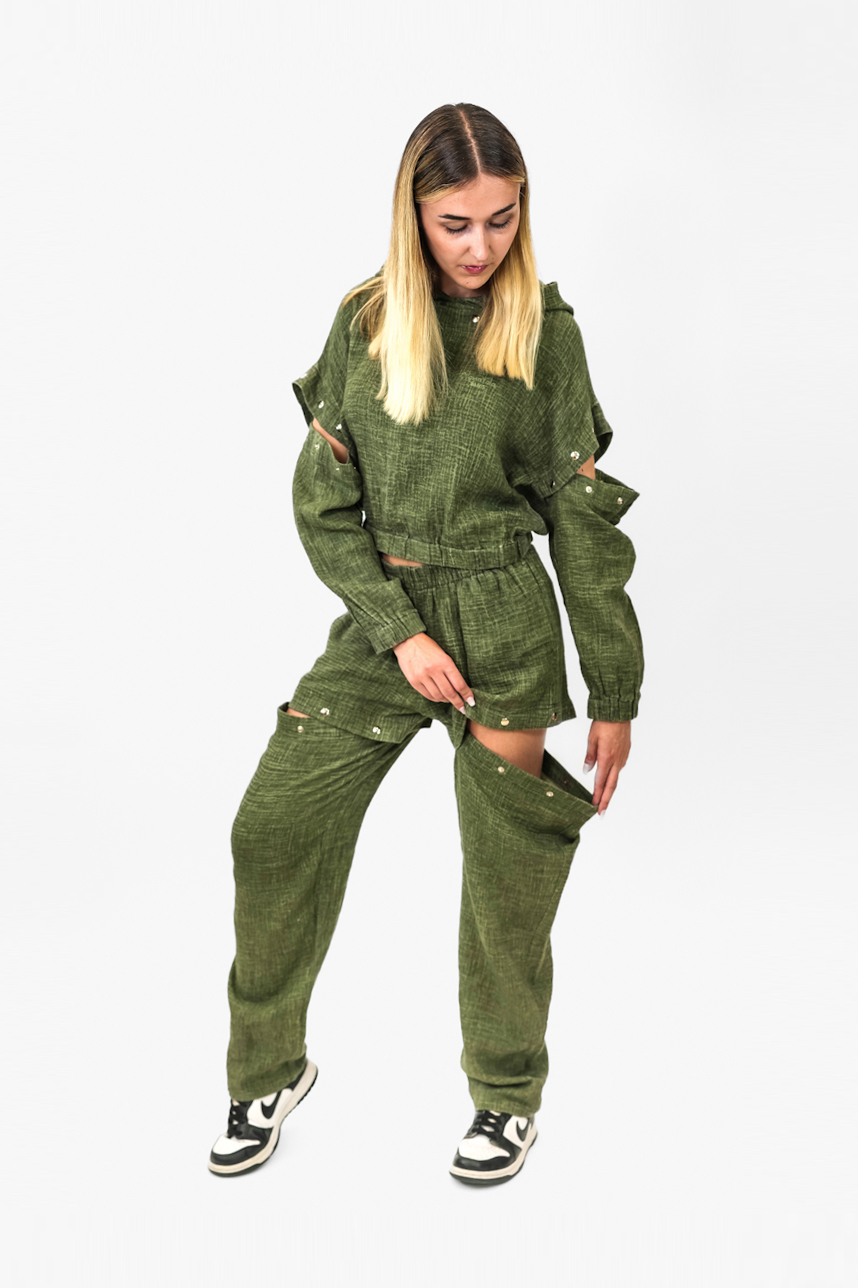 Jogging Modulable 2 en 1 Kaki MonaYola Jogging unisex en gaze de coton convertible en short. Les morceaux s’attachent et se detachent entre elles grâce à des boutons pressions. Ceinture élastique. Taille grand se porte en oversize ou légèrement ajusté Ce nogender wear confortable, ludique et utile s’adapte à vos besoin tout au long […]