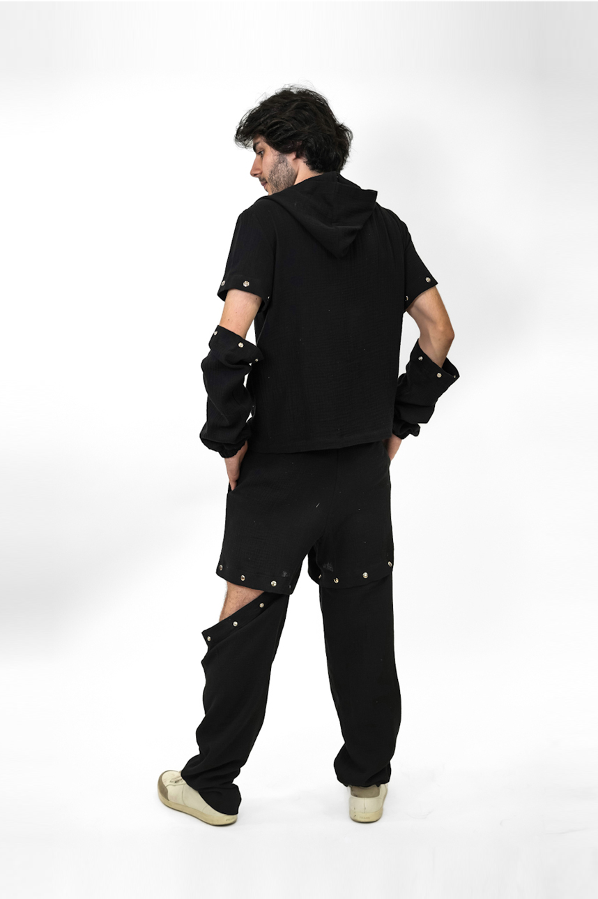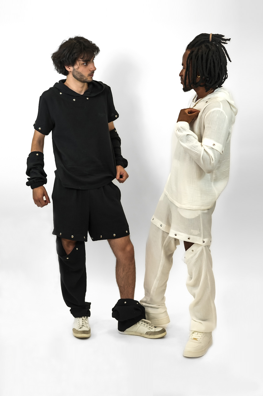 Pantalon Jogging Transformable 2 en 1 Noir MonaYola Jogging convertible en short homme ou femme, en gaze de coton. Les morceaux s’attachent et se detachent entre elles grâce à des boutons pressions. Ceinture élastique. Taille grand se porte en oversize ou légèrement ajusté Ce nogender wear confortable, ludique et utile s’adapte à vos besoin […]