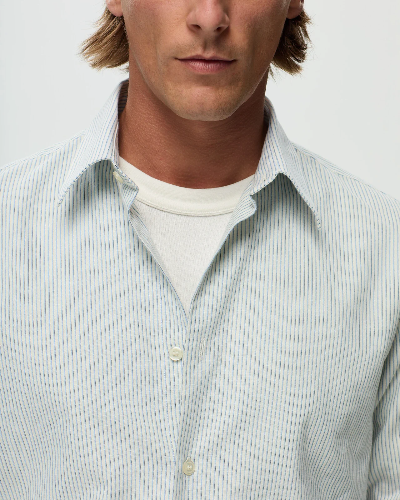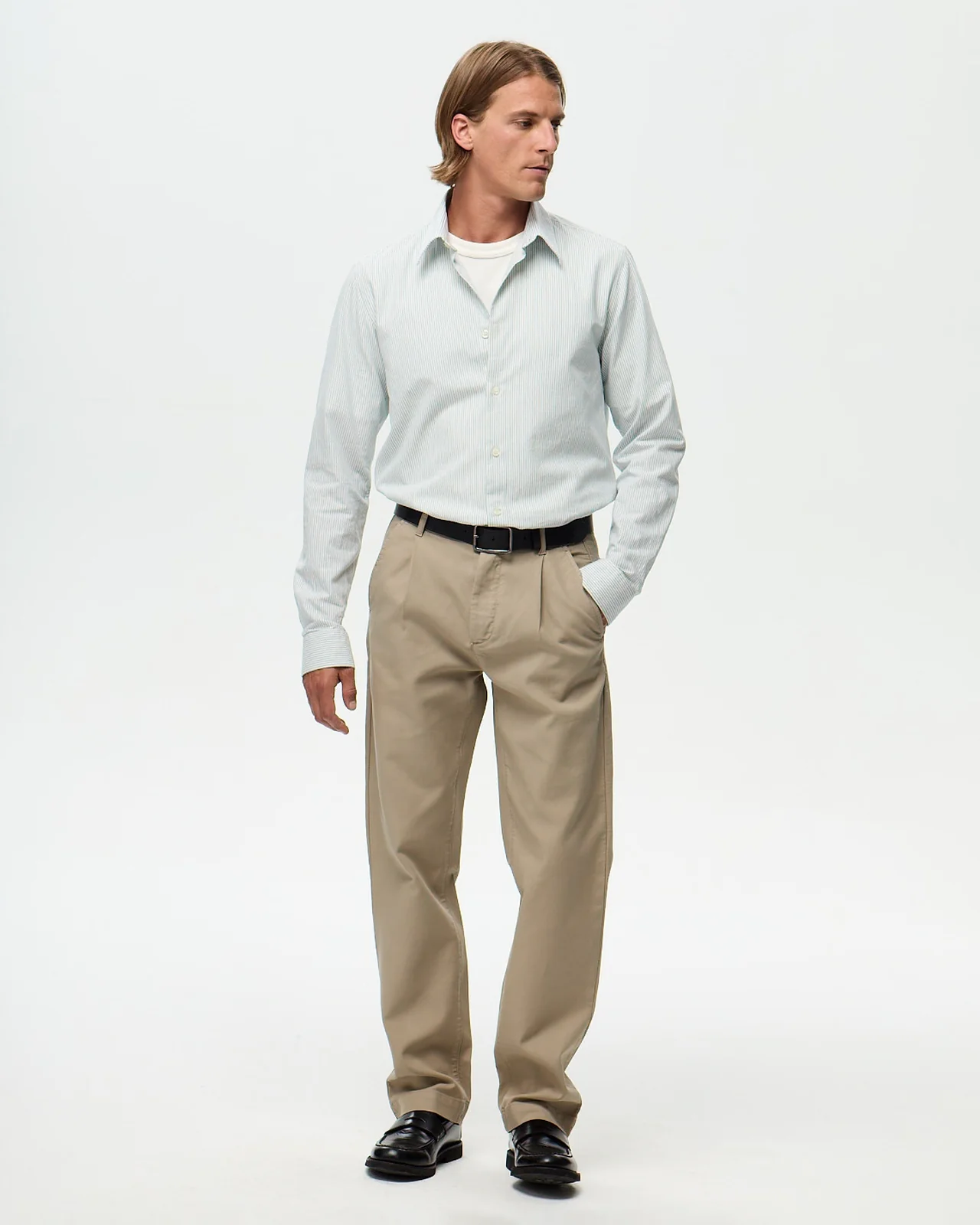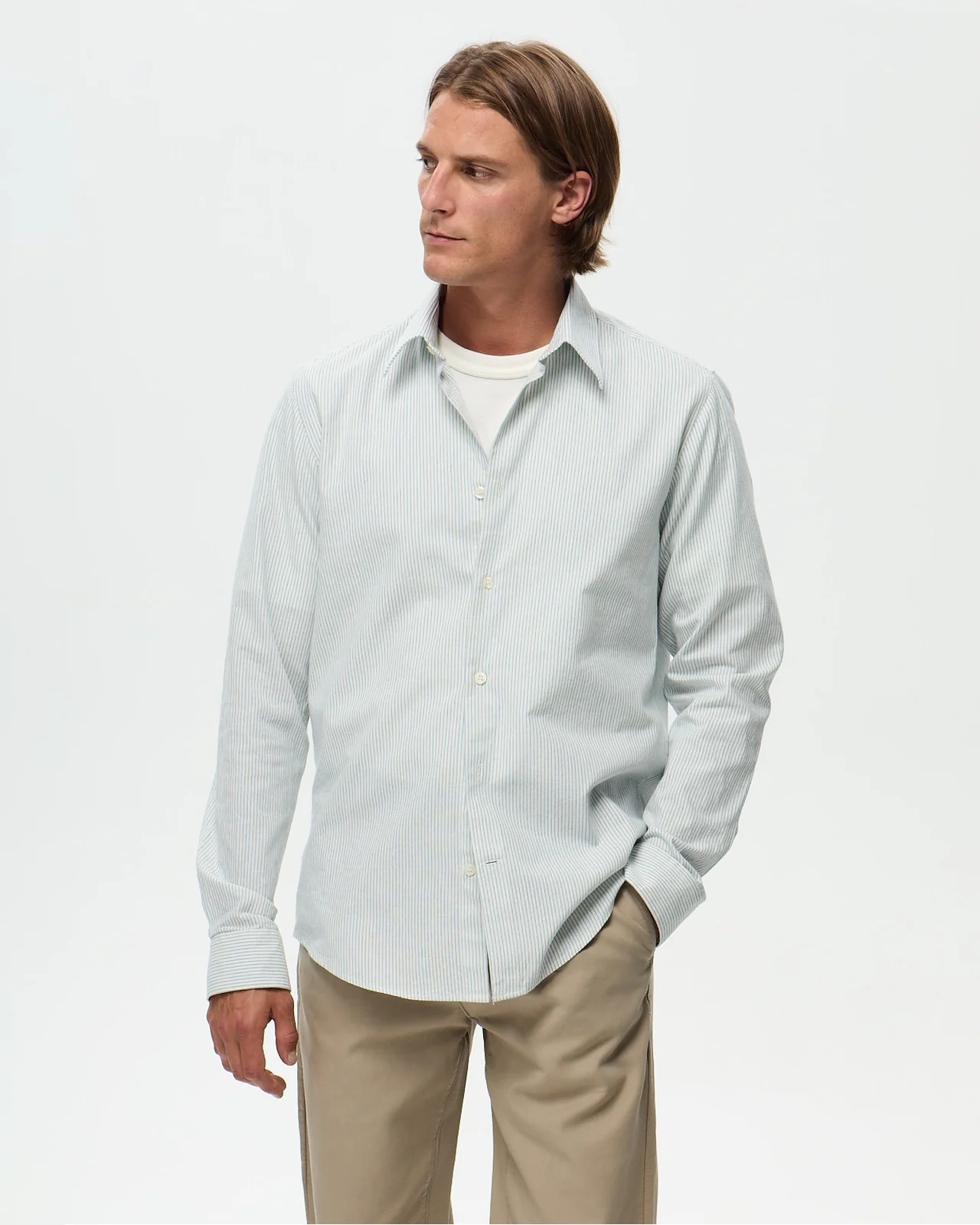 La chemise rayée fine qui capture la douceur estivale. Tissée au Portugal par une maison familiale fondée en 1958, elle révèle un tissu léger, respirant et structuré, parfait pour les beaux jours. Sa rayure fine sur fond blanc crée un effet visuel discret et raffiné, idéal en superposition ou porté seul. Sa coupe ajustée classique dessine une silhouette nette et moderne. Fabrication marocaine.