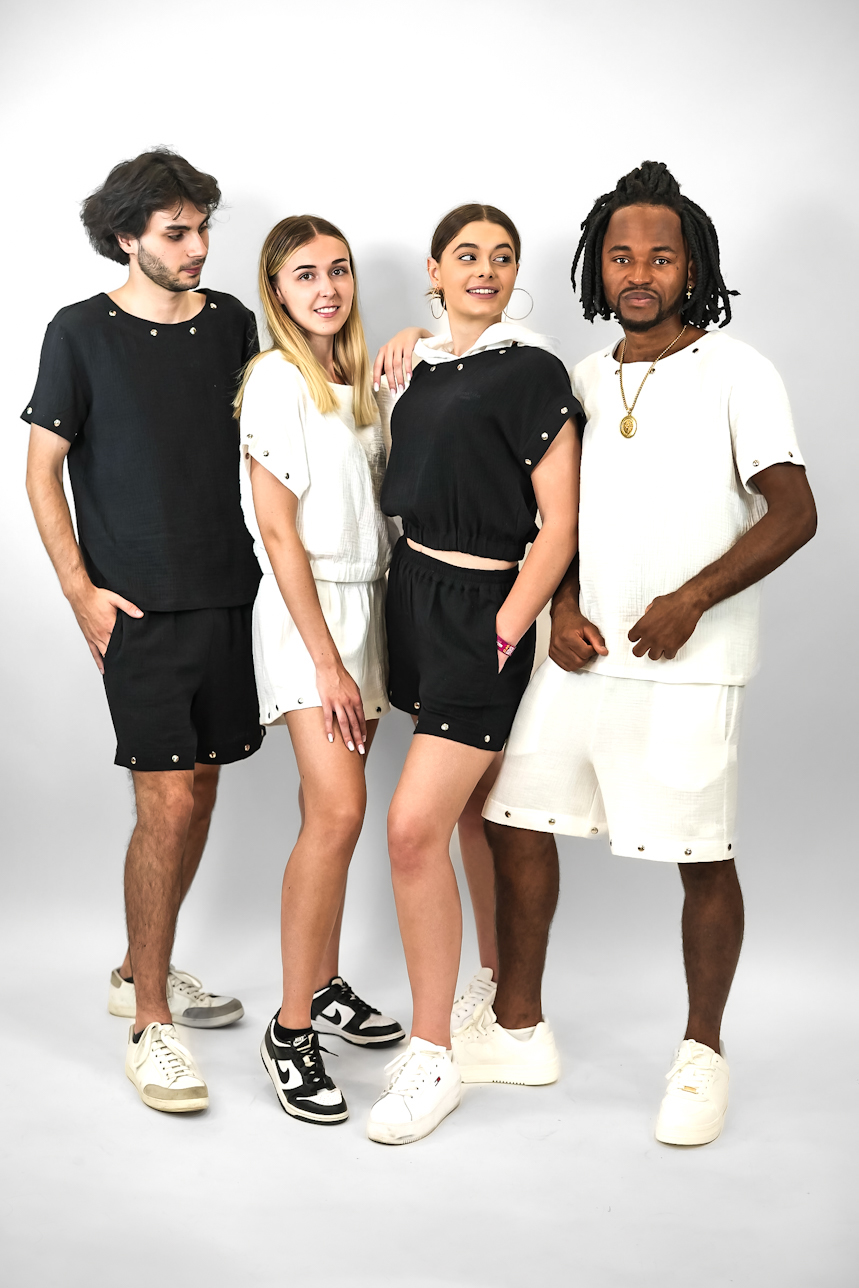 Les morceaux s’attachent et se detachent entre elles grâce à des boutons pressions, pour se transformer en T-shirt manches longues à capuche ou en T-shirt manches courtes à ou sans capuche.