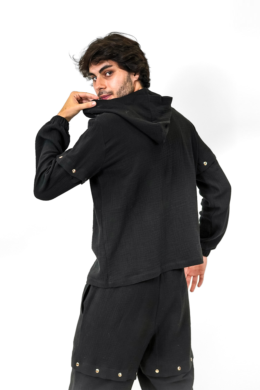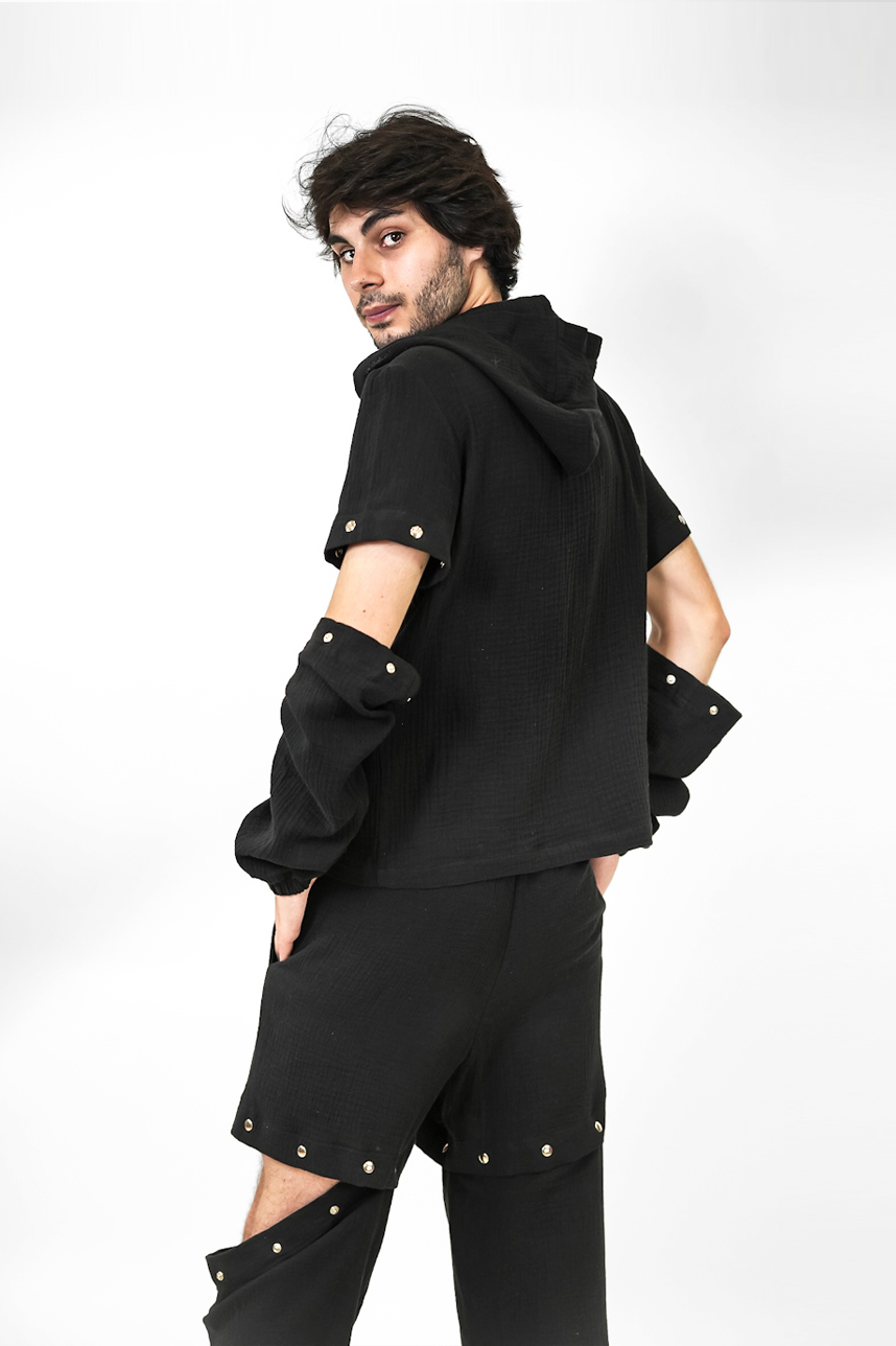 Sweatshirt homme modulable en gaze de coton, composé d’un T-shirt à Capuche et manches interchangeables et amovibles.