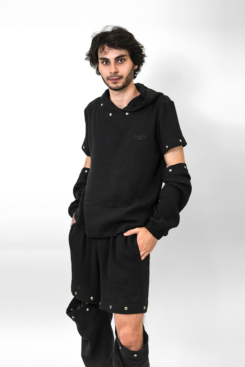 Les morceaux s’attachent et se detachent entre elles grâce à des boutons pressions, pour se transformer en T-shirt manches longues à capuche ou en T-shirt manches courtes à ou sans capuche.
