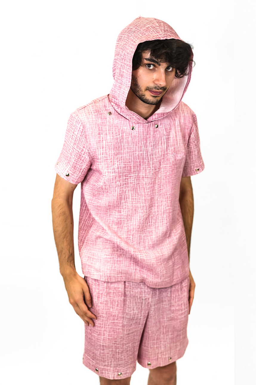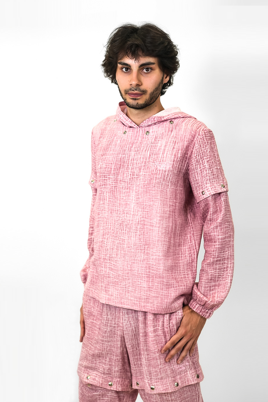 Sweatshirt homme en gaze de coton, composé d’un T-shirt à Capuche et manches interchangeables et amovibles.
