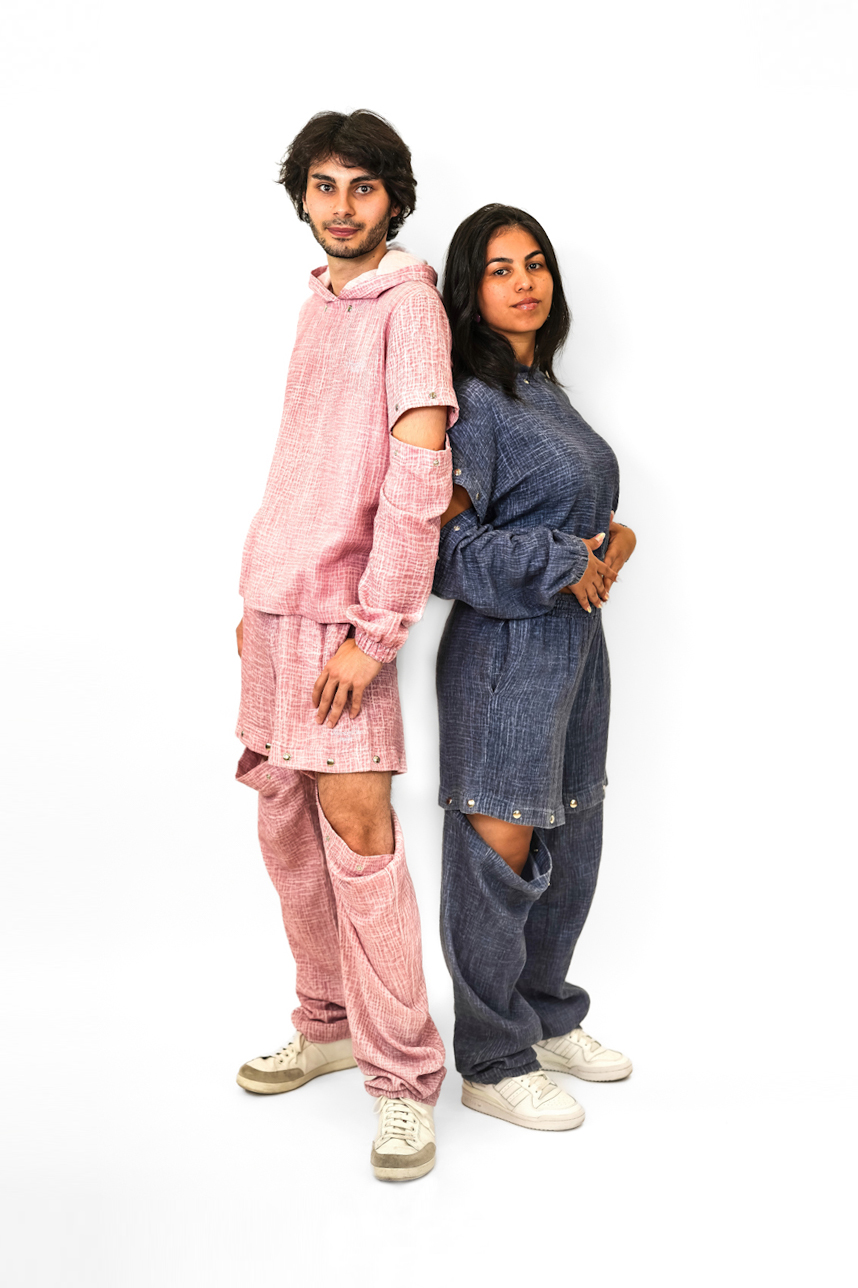 Les morceaux s’attachent et se detachent entre elles grâce à des boutons pressions, pour se transformer en T-shirt manches longues à capuche ou en T-shirt manches courtes à ou sans capuche.