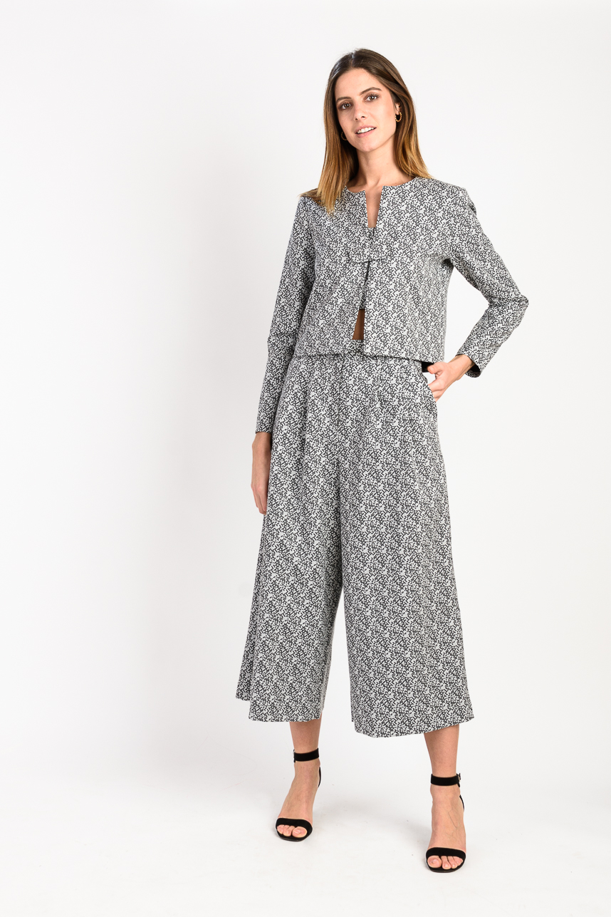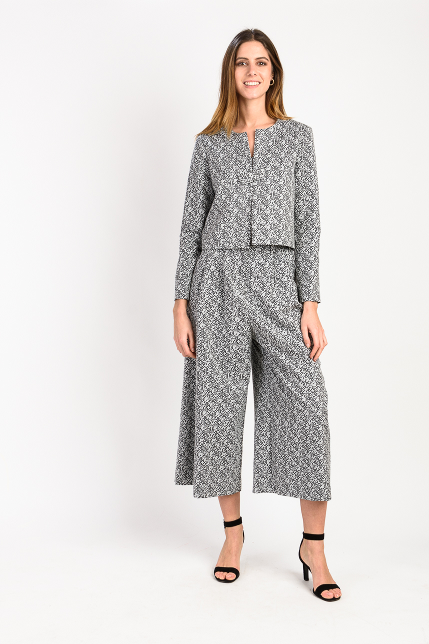 Pantalon court large accordé à la veste. Deux plis plats sur chaque coté devant.