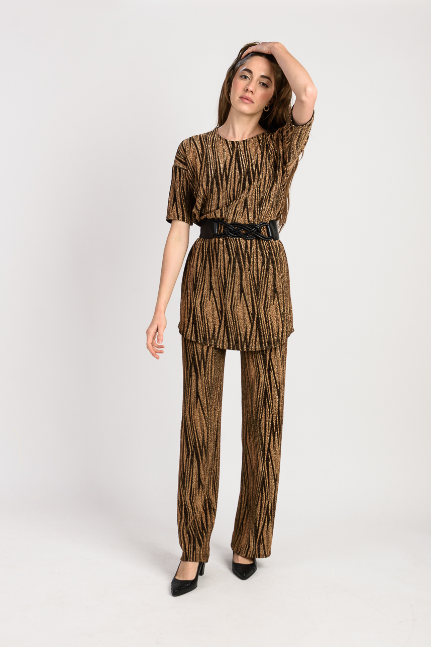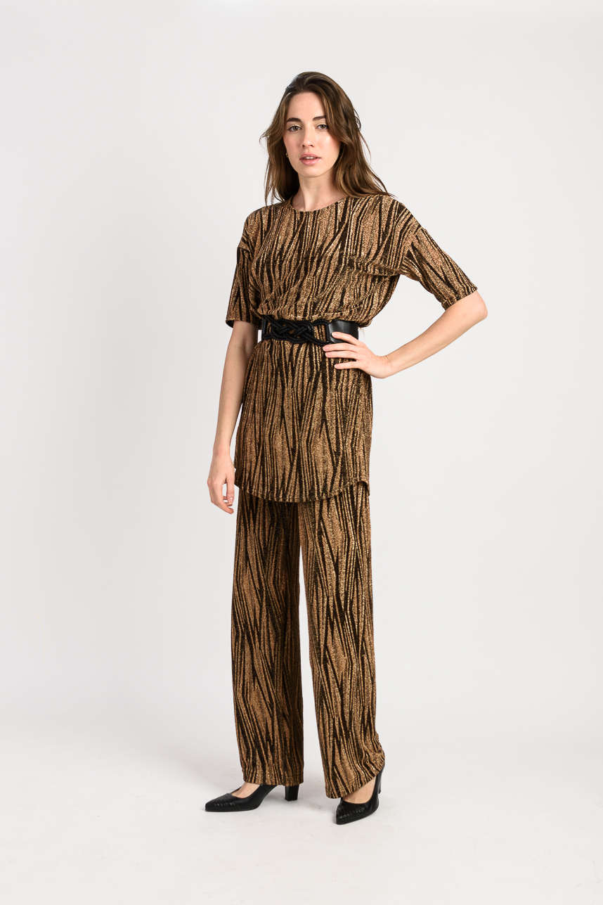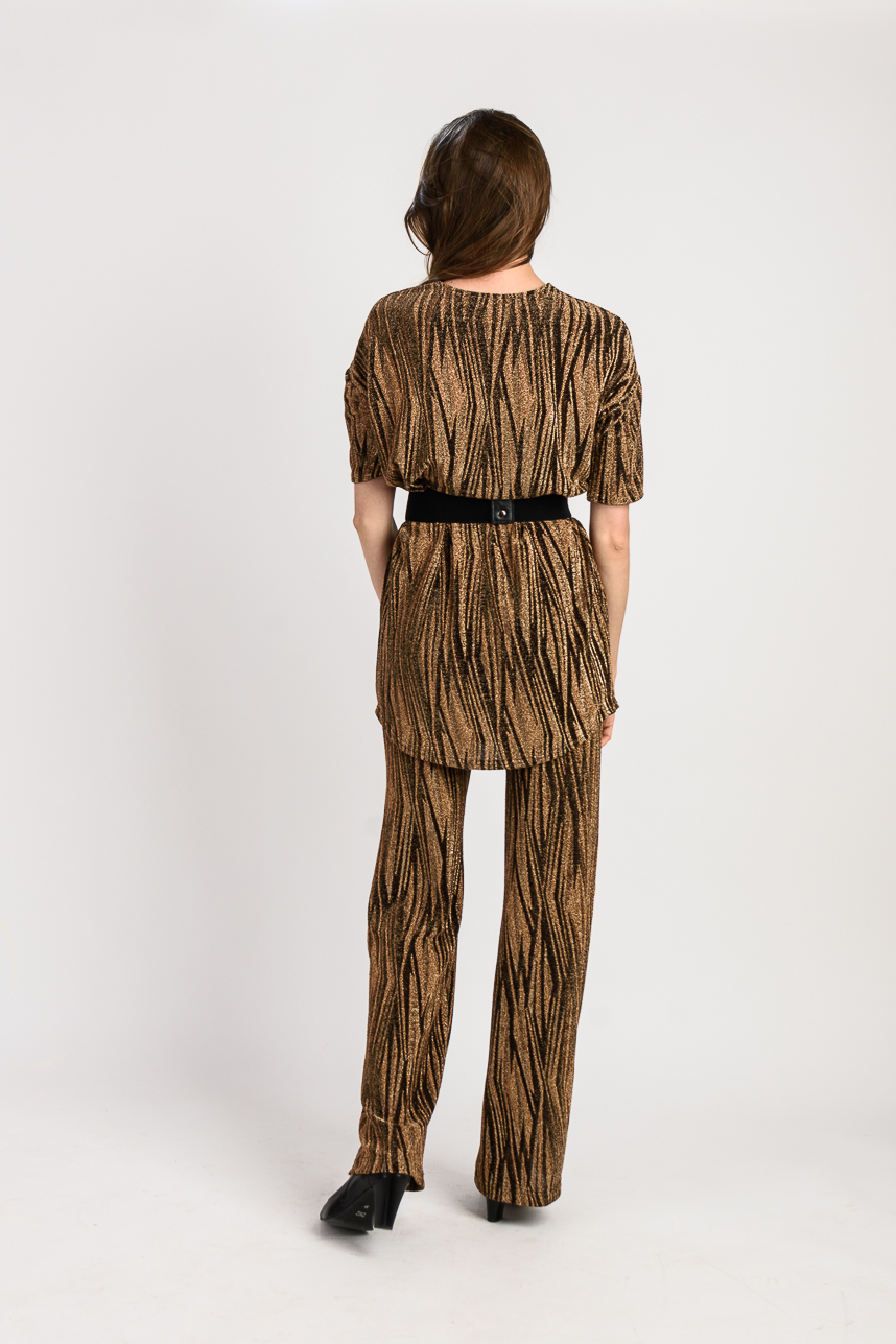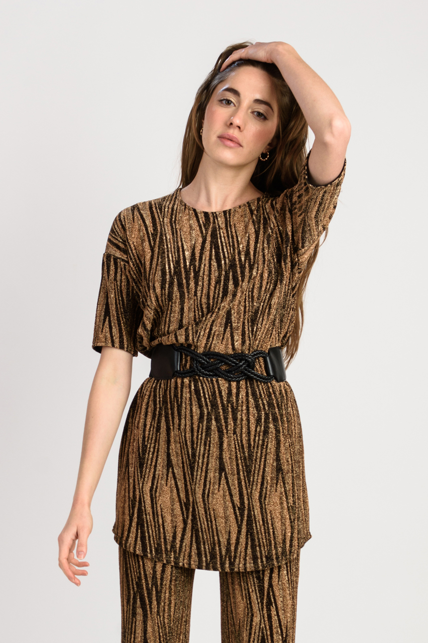 Tunique oversize confortable, en maille lurex doré, effet géométrique irrégulier.