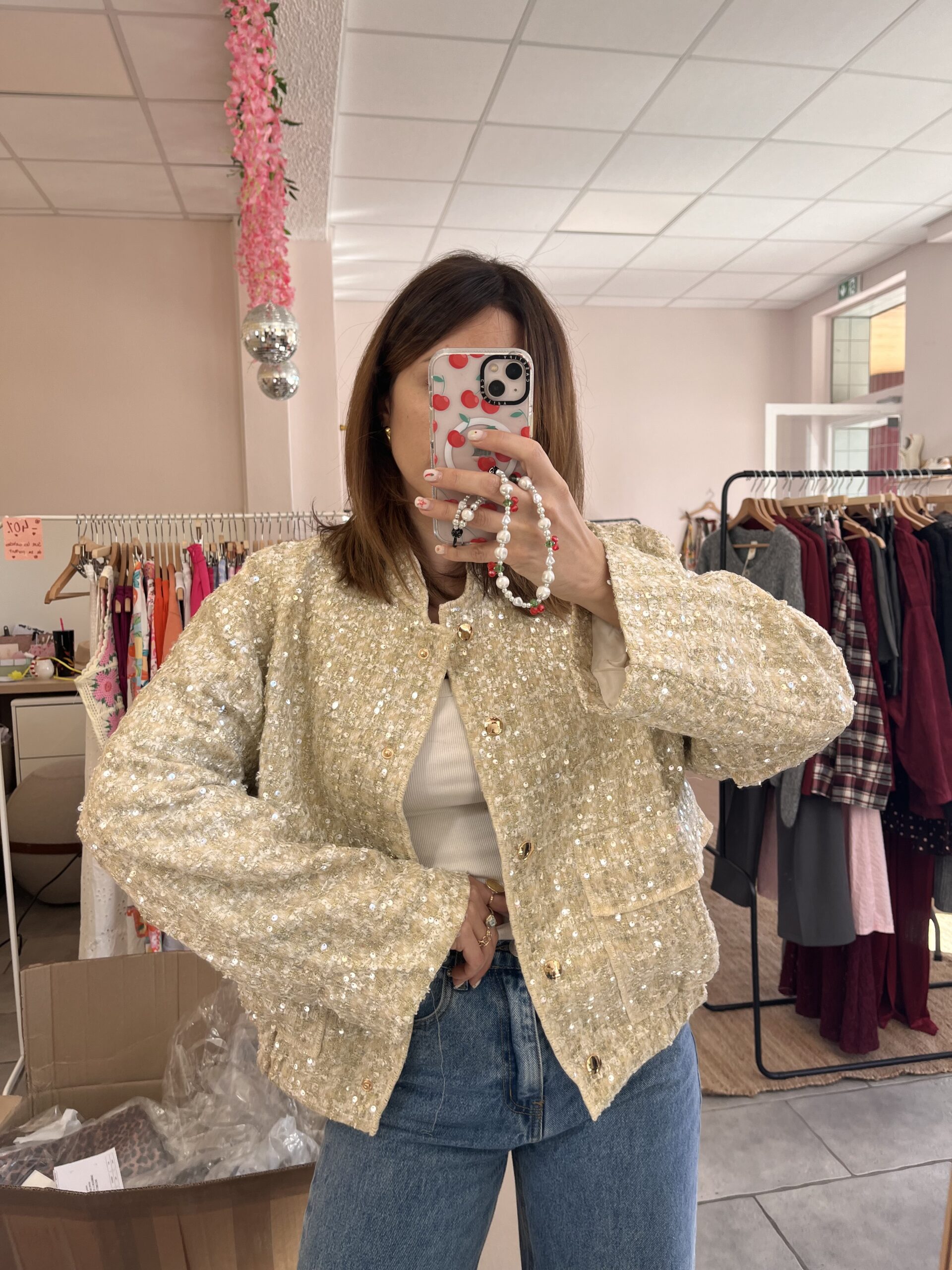 Veste oversize creme à sequins. Prendre votre taille habituelle. Fabriqué en Chine. 100% Polyester Conseil de lavage : A la main 30 degrés maximum, pas de sèche linge.