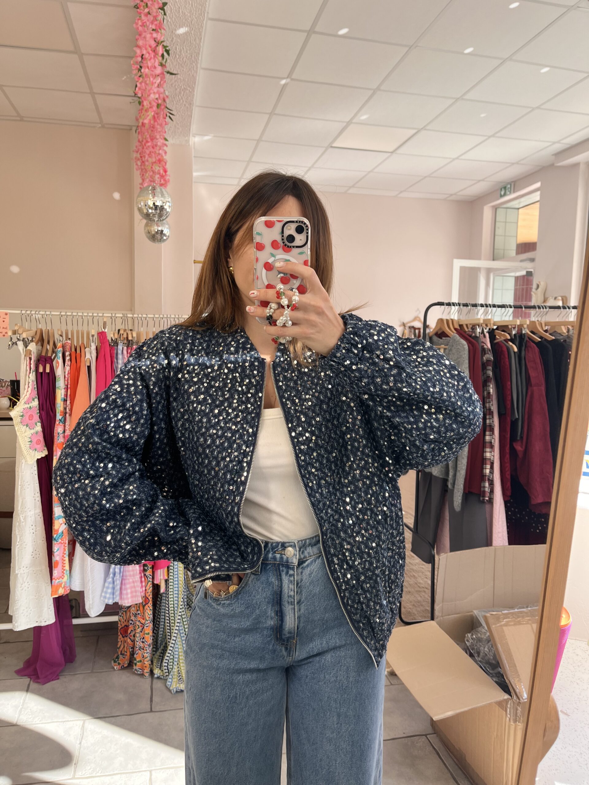 Veste oversize bomber bleu jean à sequins. Prendre votre taille habituelle. Fabriqué en Chine. 66% Coton, 26% Polyester, 10% Viscose Conseil de lavage : A la main 30 degrés maximum, pas de sèche linge.
