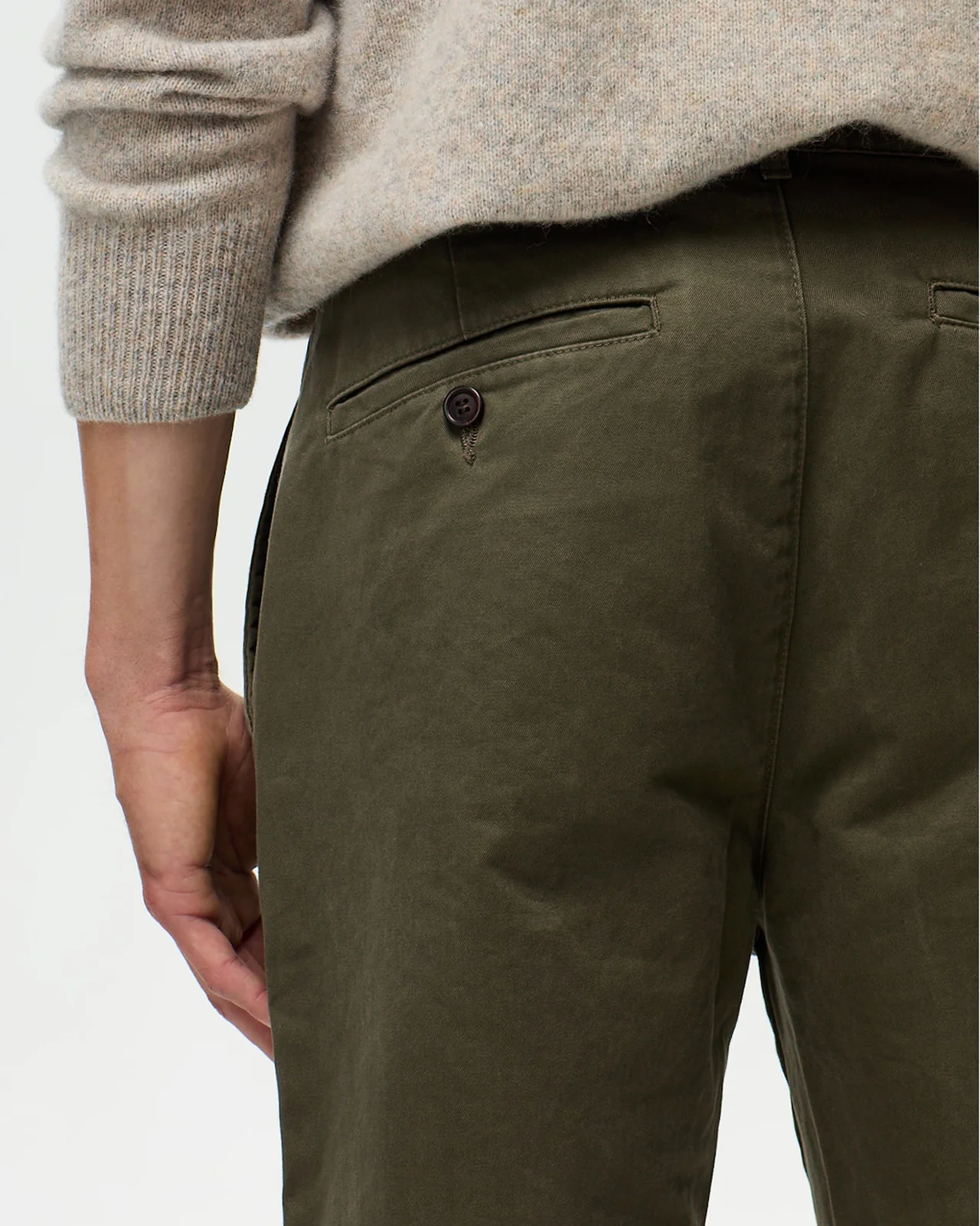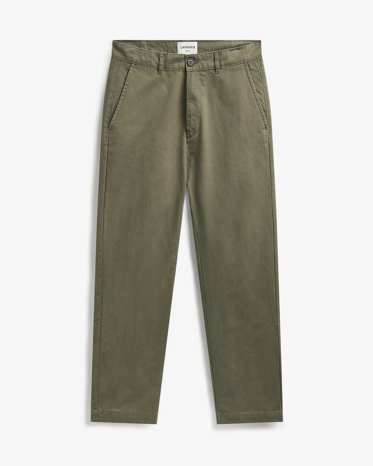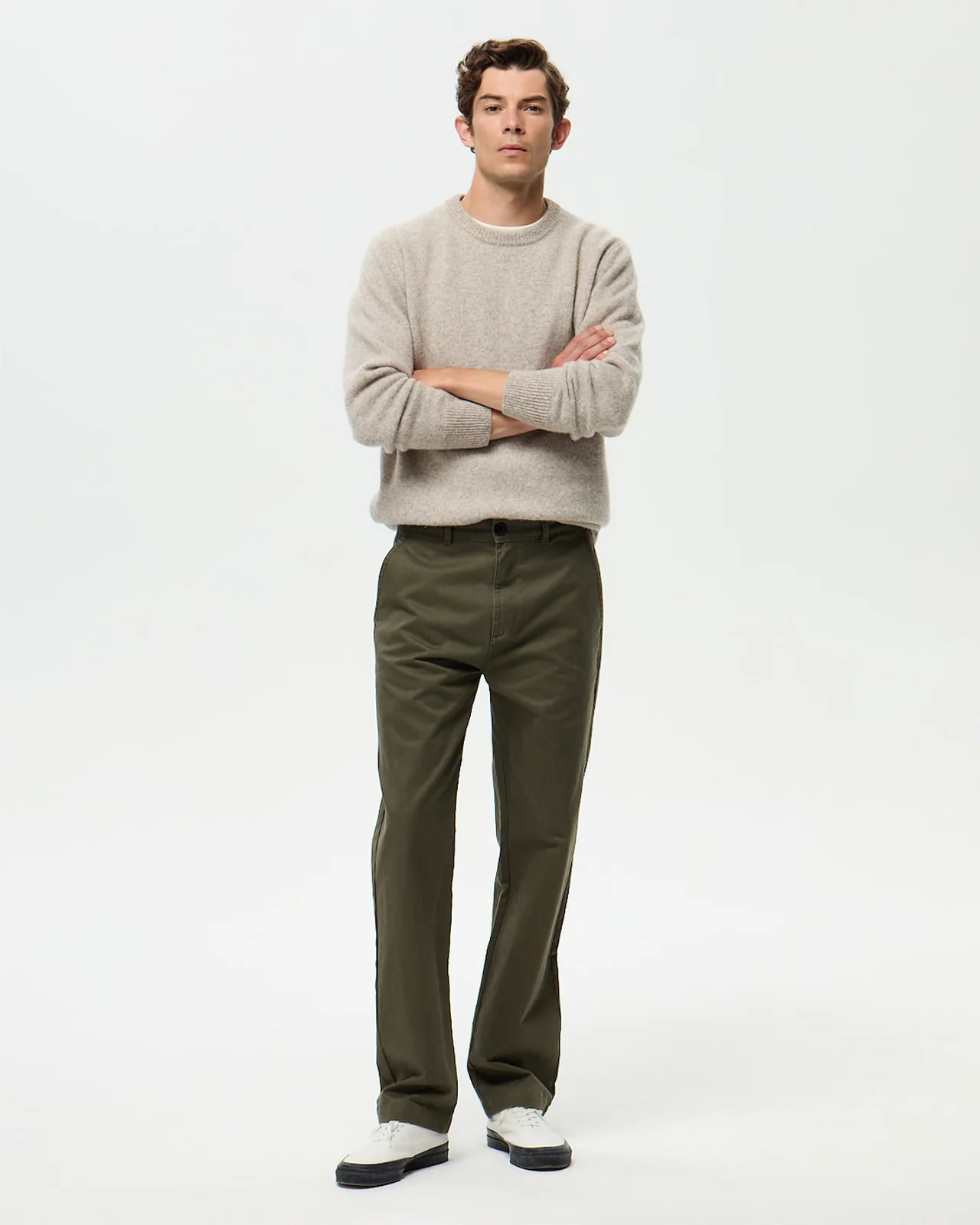 Le chino droit minimaliste fonctionnel, esprit utilitaire. Toile 100% coton robuste et respirante au fini légèrement mat. Tisseur espagnol fondé en 1953. Coupe droite ajustée, équilibre parfait entre confort au porter et silhouette structurée. Poches latérales italiennes et poches dos passepoilées boutonnées, esprit tailoring discret. Ton army essentiel et polyvalent. Fabrication marocaine.